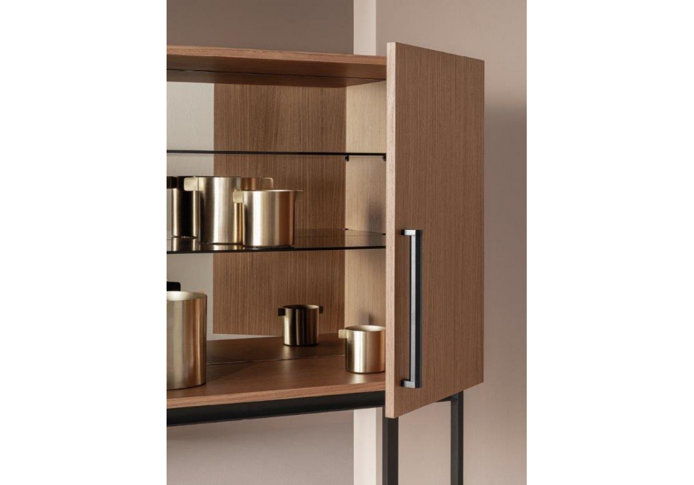 Orlando Light diseñado por Roberto Lazzeroni para Casamilano es un mueble contenedor con estructura caracterizada por paneles de aglomerado revestidos en esencia. Las puertas son de MDF con tiradores de metal pintado. Estantes y panel trasero interno en cristal ahumado. La base es de metal pintado en negro mate.