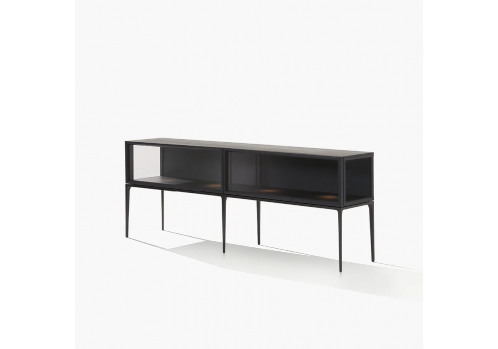 Aiko diseñado por Jean Marie Massaud para Poliform es un aparador con puertas dobles abatibles (MAK6 - Salone del Mobile 2024). Estructura en olmo negro. Respaldo/s en olmo negro o cristal transparente extralight. Laterales y frentes en olmo negro o cristal transparente extralight. Tiradores en níquel marrón mate, integrados en el perfil superior de la puerta. Sobre en olmo negro o en mármol mate y brillo. Base con patas de metal pintado níquel marrón mate.