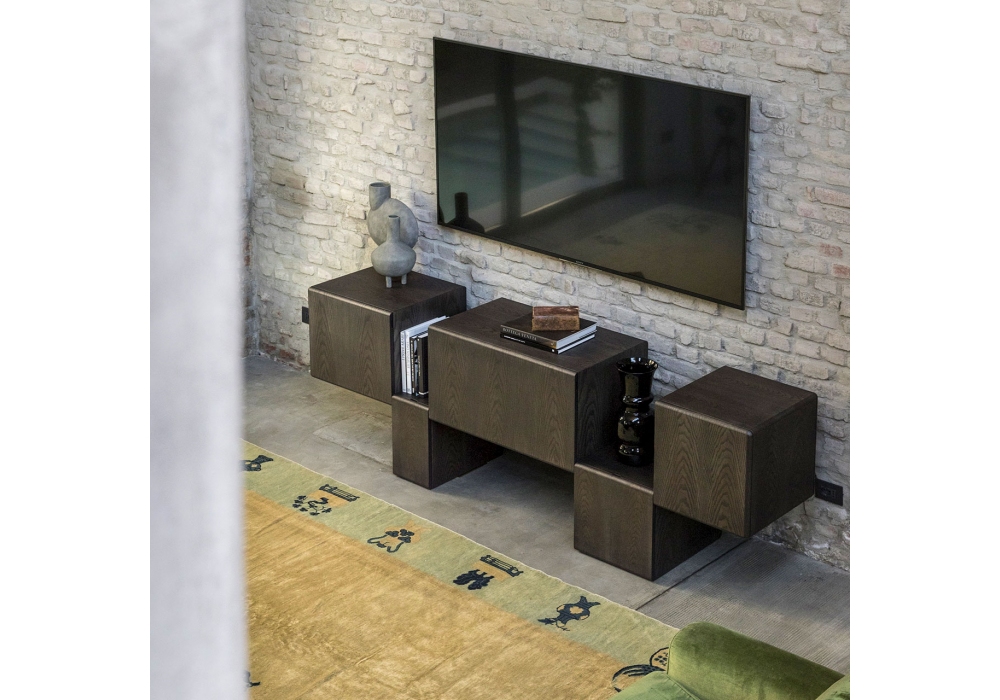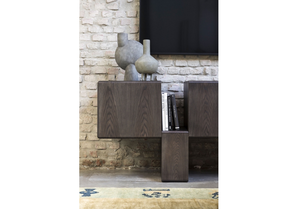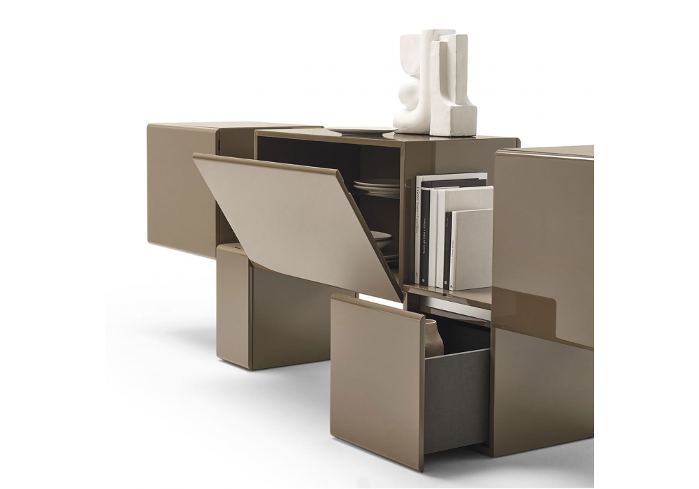 Fractal diseñado por Bellavista Piccini para Mogg es un aparador con estructura de MDF con 3 puertas y 2 cajones. Disponible en fresno teñido moka o lacado brillante o gofrado.