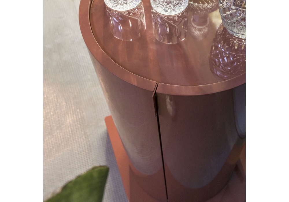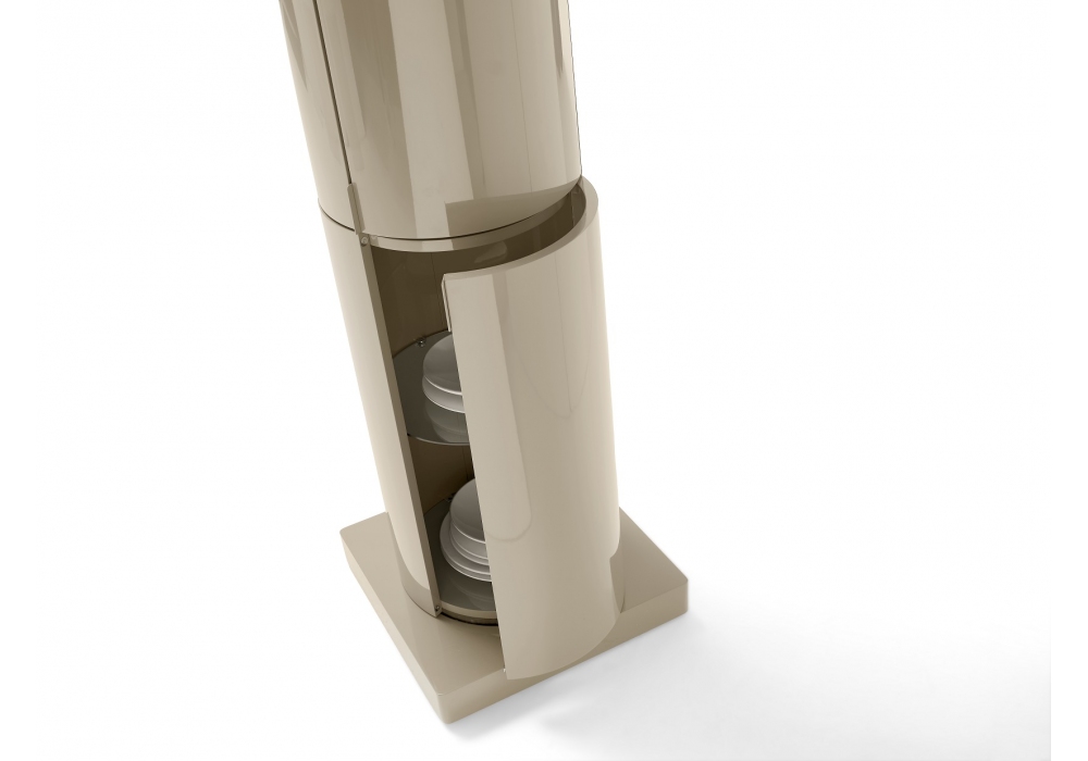 La Dori diseñada por Marco Pisati para Mogg es una columna contenedor en madera contrachapada curvada, completa con estantes de vidrio. Disponible lacado gofrado o lacado brillo. Apertura de puerta a derecha o izquierda. Disponible con 2 tipos de bases: zócalo alveolar lacado como la columna con pies regulables o placa de metal pintado de negro (no regulable).