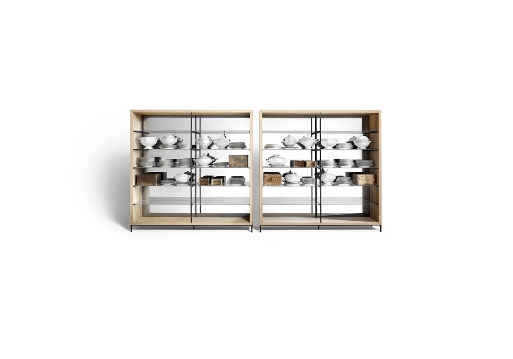 Combi Open Unit diseñado por Piero Lissoni para DePadova es un mueble contenedor abierto con montantes y base de acero pintado en polvo negro mate y patas regulables de metal. Los paneles son de tablero laminado chapado en roble. Los estantes y la parte trasera son de cristal. Combi Open Unit está disponible en diferentes acabados y con o sin sistema de iluminación.