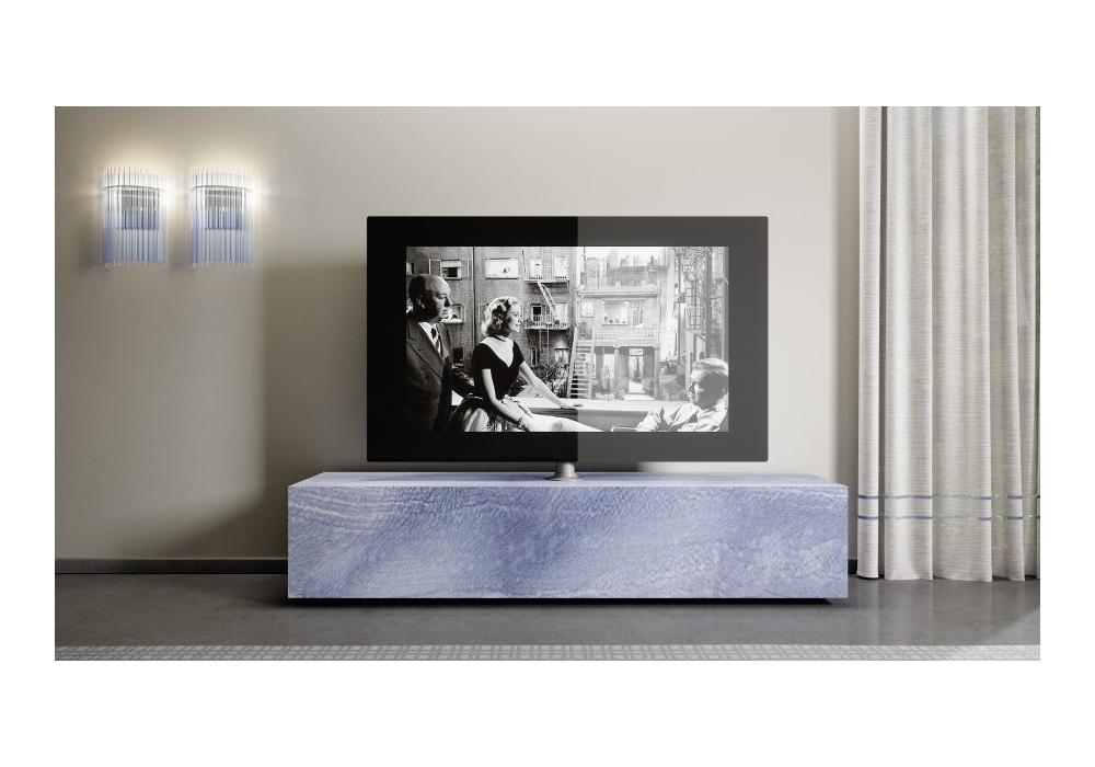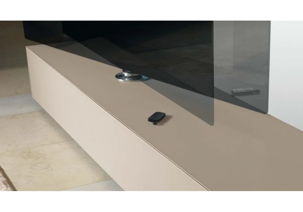 Luna Hi-Fi diseñado por Riccardo Lucatello para Reflex Angelo es un mueble contenedor con estructura de madera revestida de cristal. Apertura mediante 1 puerta abatible. Interior en negro mate. Disponible en cristal pintado o pintado al ácido o en Marmoreflex/Legnoreflex. Mueble TV opcional, giratorio con motor y mando a distancia, posicionable a la derecha, al centro o a la izquierda.