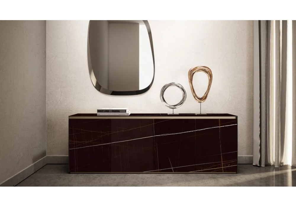 Monolite diseñado por Reflex Angelo es un aparador con estructura de madera revestida de cristal lacado o lacado al ácido, o bien en Marmoreflex/Legnoreflex. Perfil y zócalo en acabado Bronce. Disponible en dos medidas.