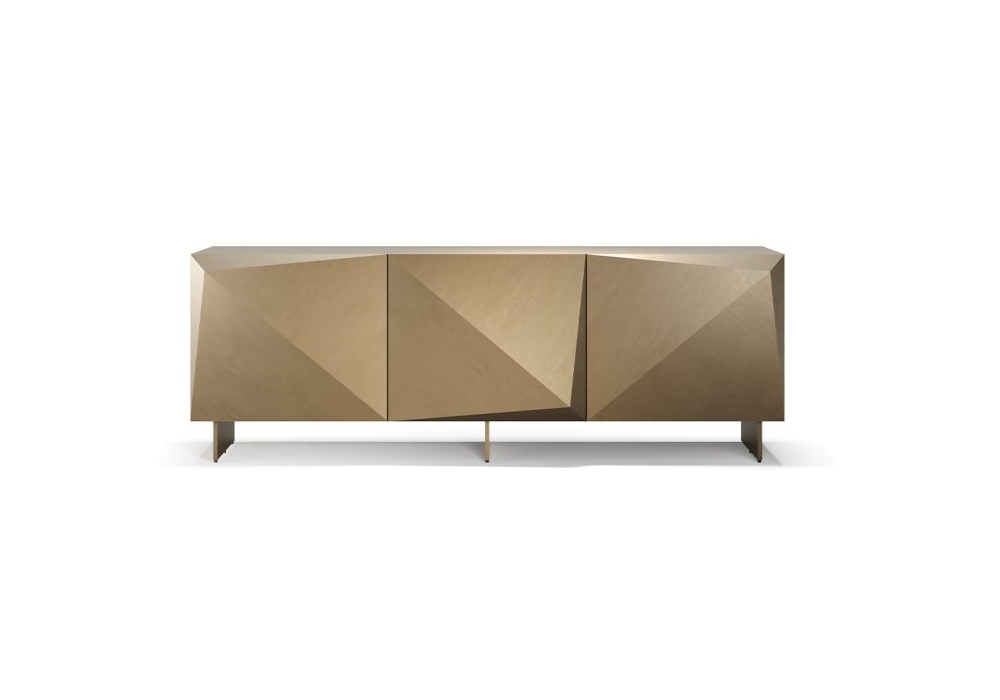 Origami Maxi diseñado por Reflex Angelo es un aparador de madera con 3 puertas. Estantes internos de cristal. Patas de cristal transparente o metal acabado bronce.