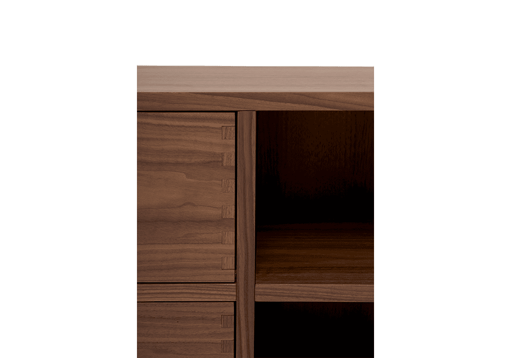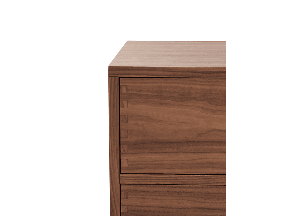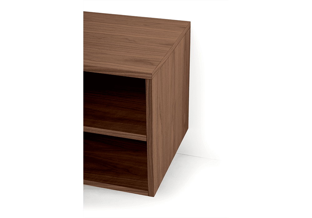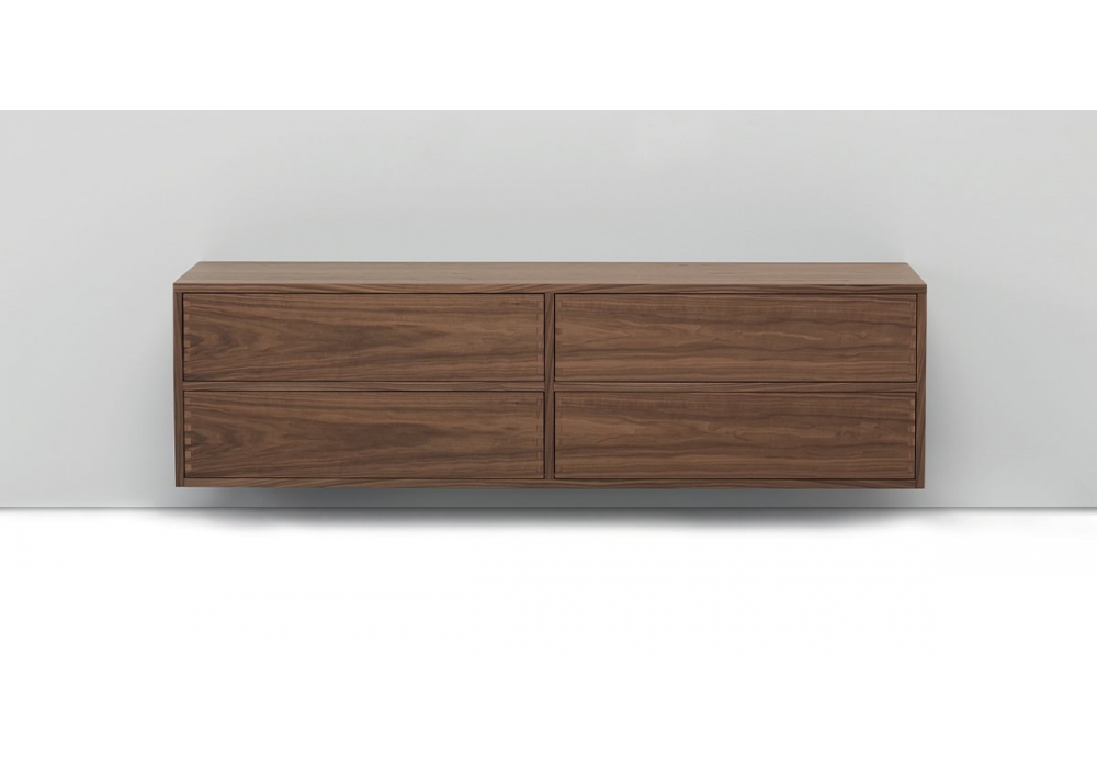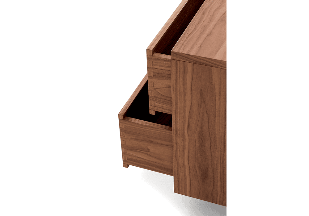 Wood-In diseñado por Piero Lissoni para DePadova es un mueble contenedor con estructura y cajones de tablero de álamo chapado en nogal Canaletto o roble oscuro, con acabado de barniz transparente. Los cajones, con juntas de peine de madera maciza, se deslizan sobre guías con mecanismo amortiguado y se abren con un solo toque. Patas de acero bruñido con deslizadores ajustables. Tablero de mármol con acabado hidrófugo o poliéster mate, o de madera con el mismo acabado que la estructura.