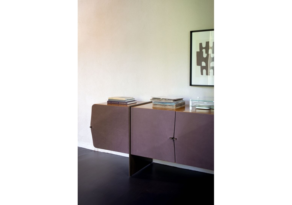 Pierce diseñado por Draga & Aurel para Baxter es un aparador con estructura lacada brillante y puertas, frentes, cajones y respaldo tapizados en piel. Estantes interiores de vidrio extraclaro biselado de 15 mm de grosor. Patas y detalles de metal con distintos acabados. Pies regulables.