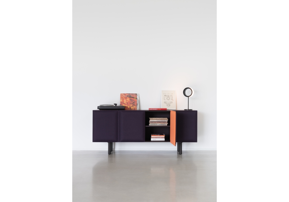 Tacito diseñado por Alessandro Stabile para Magis es un contenedor con estructura (laterales, trasera y estantes) en MDF pintado, puertas de fieltro y patas de aluminio anodizado acabado marrón oscuro.
