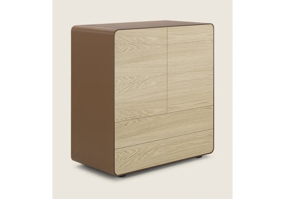 Clarence diseñado por Antonio Citterio para Flexform es un mueble contenedor con estructura de madera, disponible en diferentes acabados. Revestimiento en cuero en varios colores. Se apoya sobre patas de madera pintadas en negro mate. Disponible con dos o tres cajones.