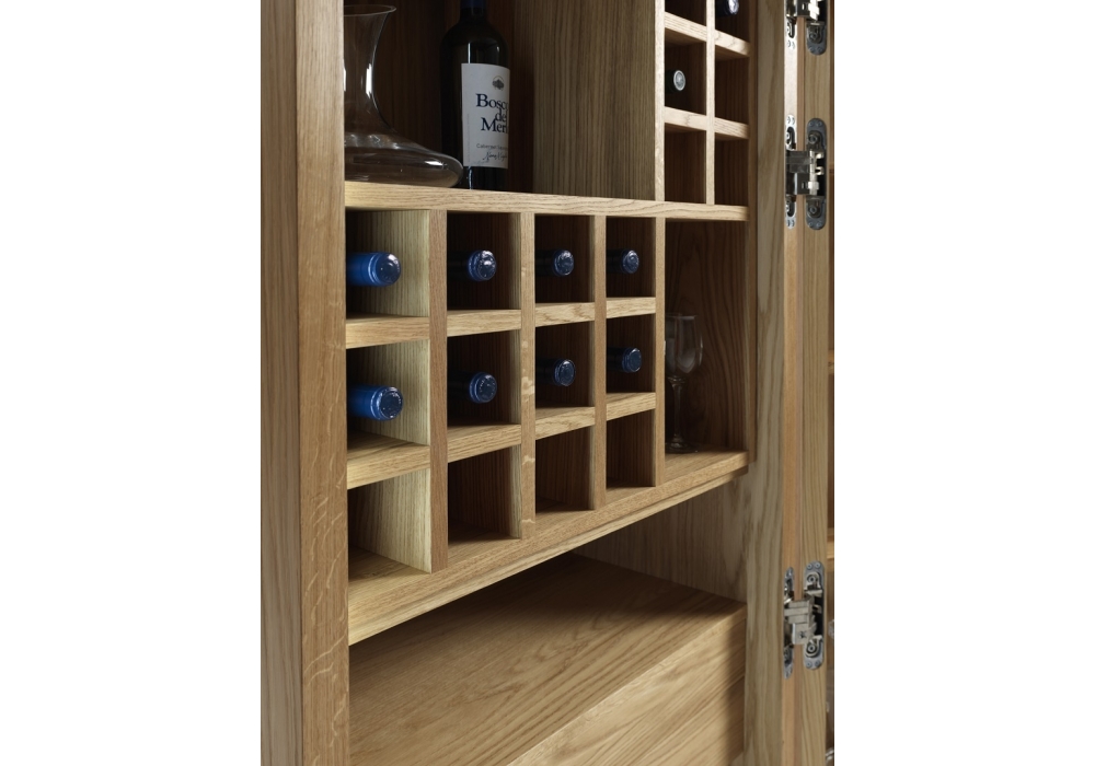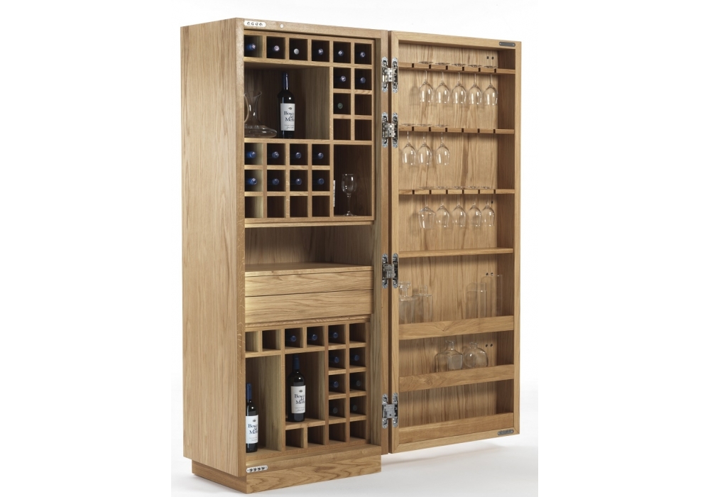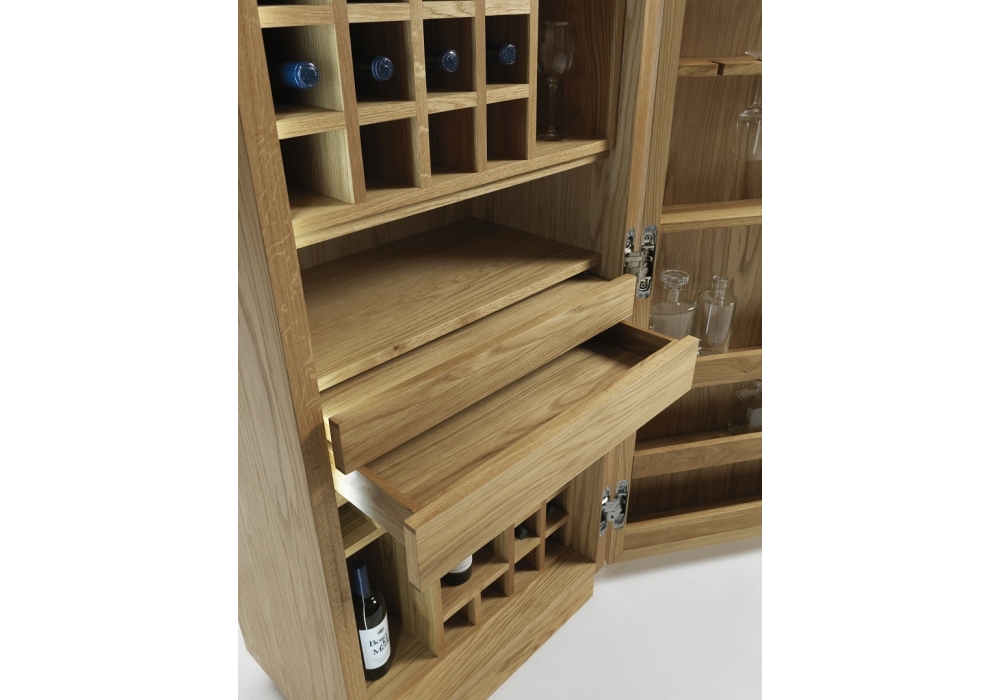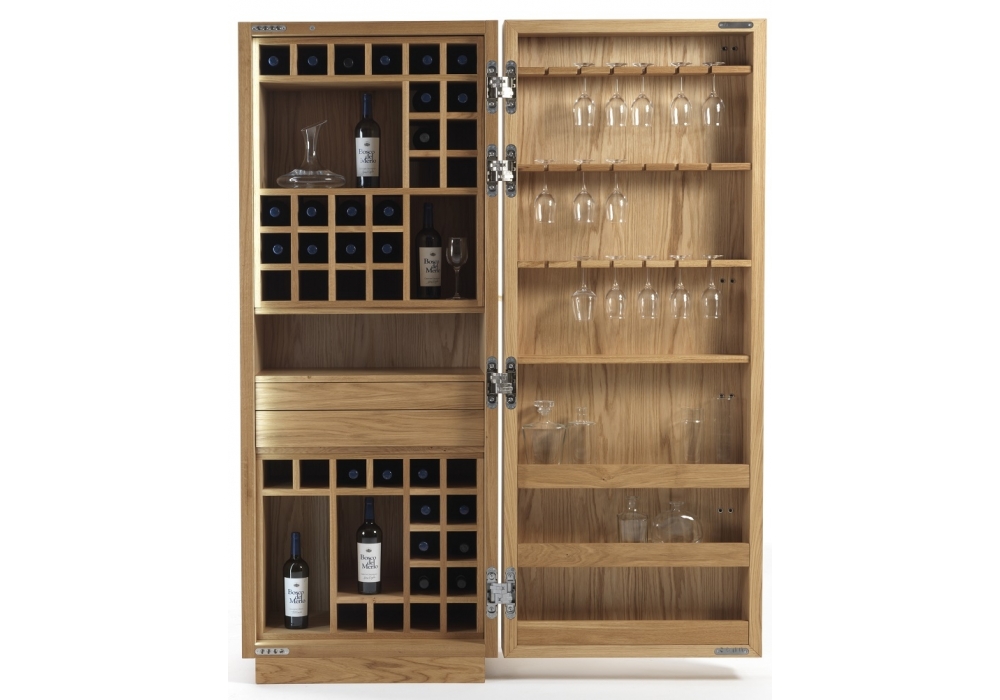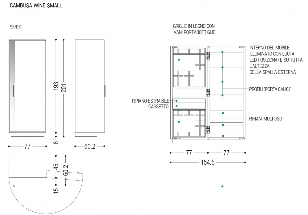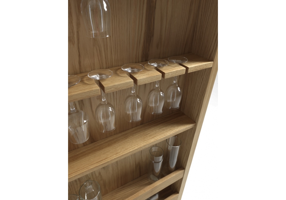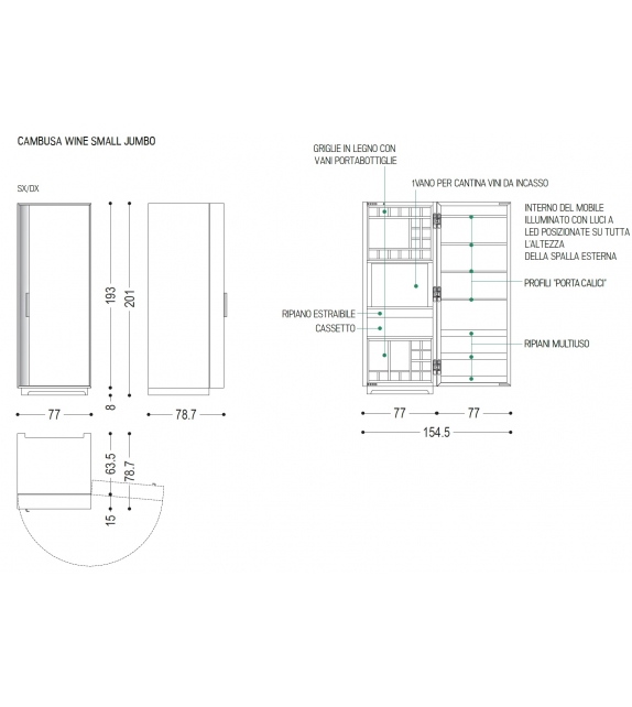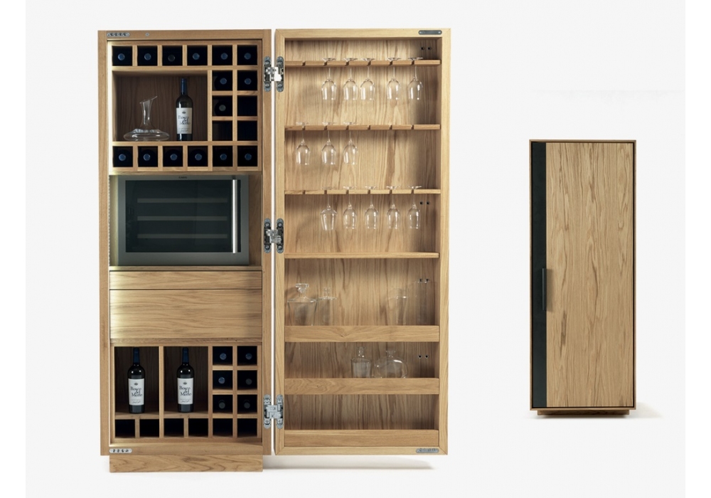 Cambusa Wine Small diseñado por Giuliano Cappelletti para Riva 1920 es un mueble contenedor multifuncional en blockboard y madera maciza con puerta simple con ángulo de apertura de 180°. La distribución interna incluye compartimentos de almacenamiento para botellas y vasos, con la posibilidad de insertar pequeños electrodomésticos (en la versión Jumbo). La puerta es de contención y en el interior es posible disponer vasos y accesorios. El interior del mueble se ilumina mediante una tira de LED situada en el hombro exterior, cuyo encendido es automático mediante un sensor que se activa al abrir la puerta.