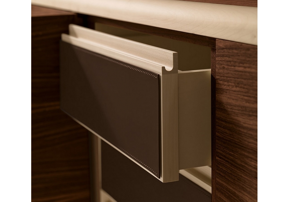 Bull is a cabinet designed by Roberto Lazzeroni for Giorgetti. Cabinet with four doors and the structure in curved plywood with indian rosewood veneer for the external part and maple wood veneer for the internal part. The top is in poplar plywood and solid maple wood with the inserts available in indian rosewood and marble. Inside each of the two central doors there is a 3-drawer chest with the frontal side in saddle leather and the completely removable drawers have recessed sliding runners and silent system closing. The internal shelves of the lateral doors are available in bronze tempered crystal glass or, on request, in maple and the internal lateral compartments have LEDs with a fading switching on and off sensor. The profile of the base and the hinges are painted in a bronze colour with natural effect.