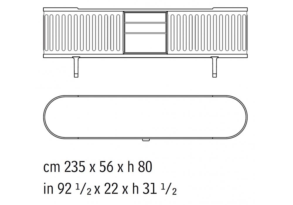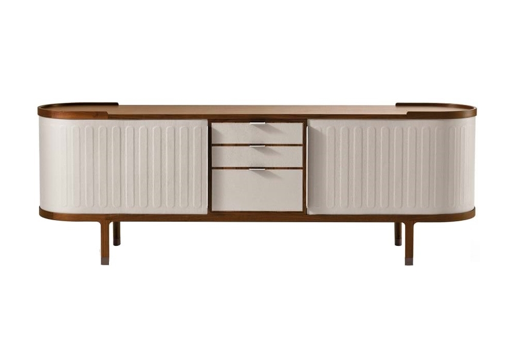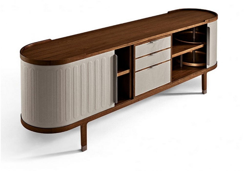 Dia is a cabinet designed by Chi Wing Lo for Giorgetti. Cabinet with sliding leather doors and the frame in solid wood and veneer in walnut canaletto wood. It is composed of one chest of drawers, wood shelves and two adjustable height swivel trays in walnut canaletto wood. The feet are in solid walnut canaletto wood and the metal foot-caps are painted in a bronze colour.