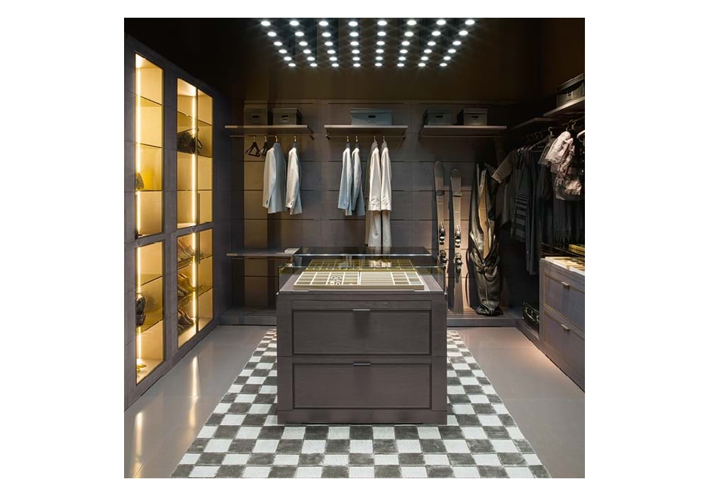Oli is a modular furniture designed by Chi Wing Lo for Giorgetti. Sectional piece of furniture in maple or walnut canaletto wood, which is born from the assembly of different elements which can generate an infinite number of arrangements, suitable for different environments such as dining, living, office and wardrobe area. Each container is available in the following versions: open element, with wooden door, with crystal glass doors, with flap door, with 2 or 4 drawers with sliding runners (with possibility of drawers with electronic locking system). All the illuminating parts are LEDs which are turned on thanks to a Master Remote Control. The version with the frame in walnut canaletto wood foresees the middle shelf and all the elements with the accessible parts in white painted Fiddleback Sycamore and the tempered glass and the paint on the metallic parts in a bronze finish. The version all in polished maple has transparent glasses and the metallic parts in a champagne colour. The feet can be adjusted for levelling.