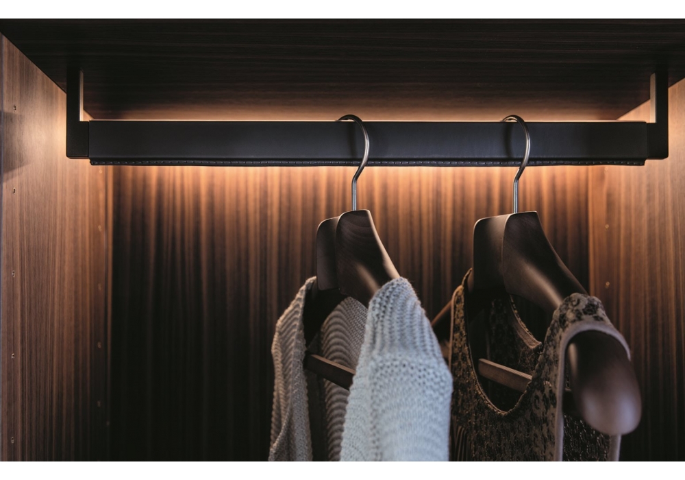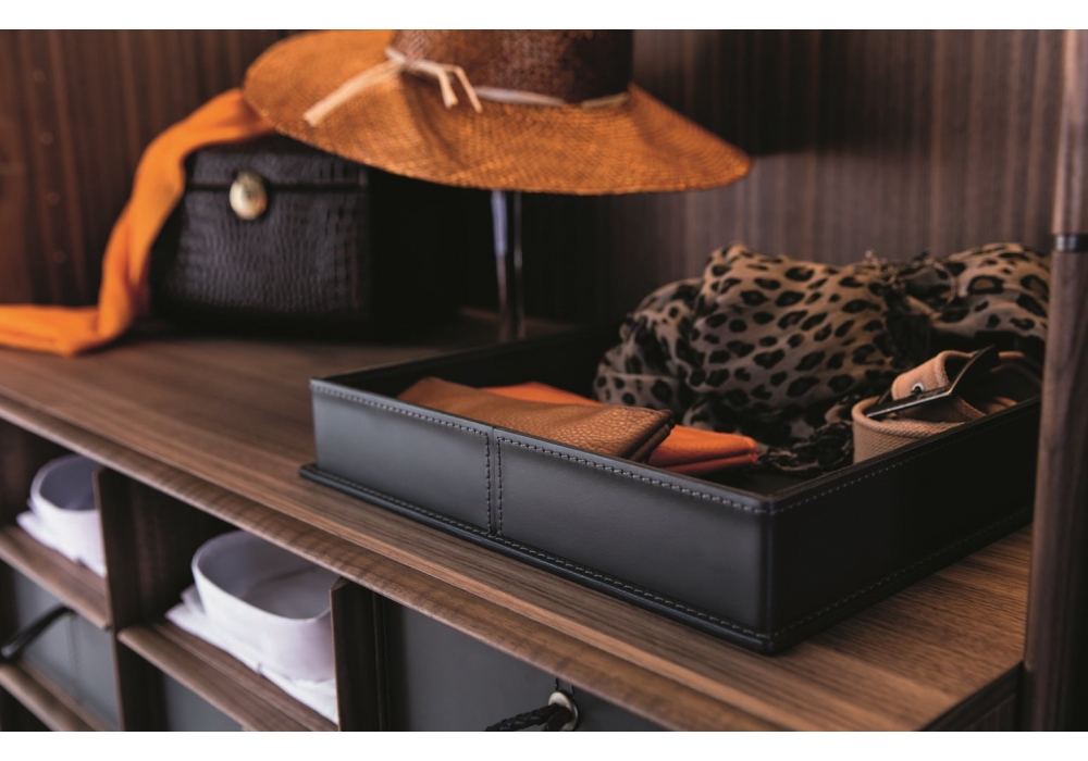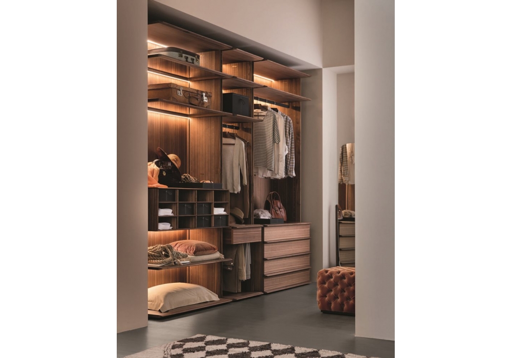 My Suite diseñado por Gabriele & Oscar Buratti para Porada es un vestidor modular en nogal canaletta. Bordes de madera maciza con inserción en metal peltre. Se puede personalizar completamente con elementos y accesorios de madera, cristal ahumado o revestidos de cuoietto. Los tiradores son en piel entrelazada con técnica scoubidou con detalle en metal. Las repisas pueden tener luz LED abajo.