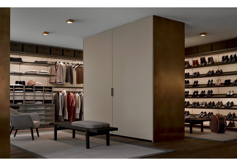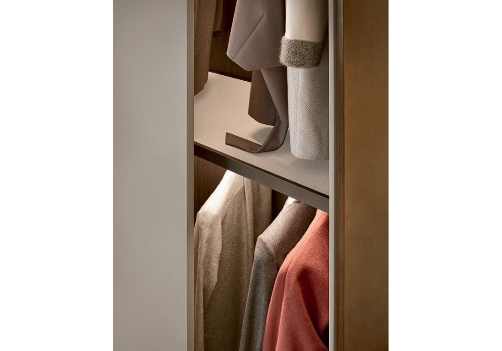 Skin diseñado por R&D Poliform es un armario con puertas en melamina y perfiles de aluminio. Su versatilidad de composición lo hace adecuado para cualquier entorno.