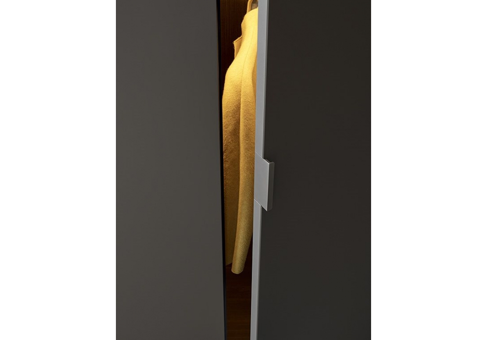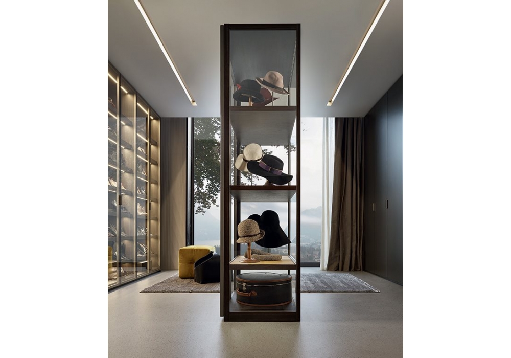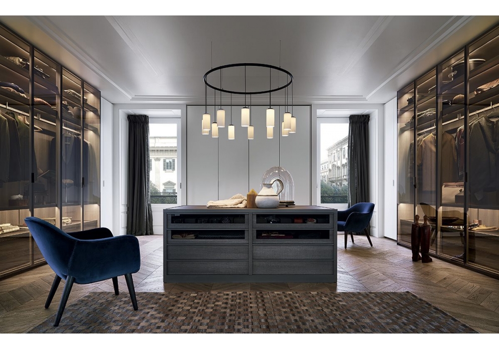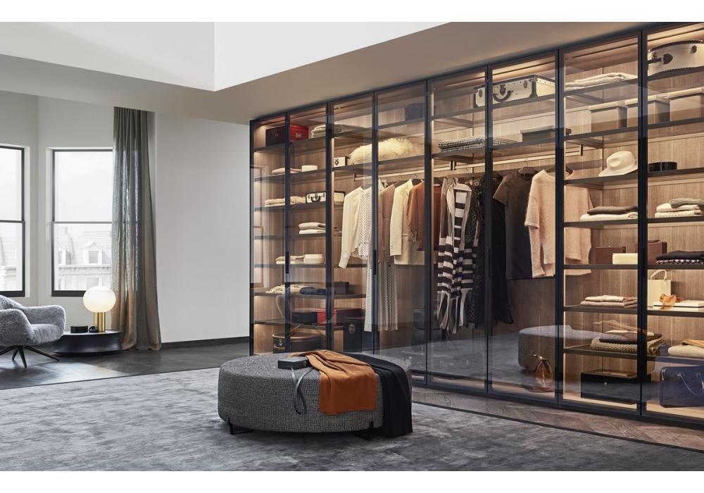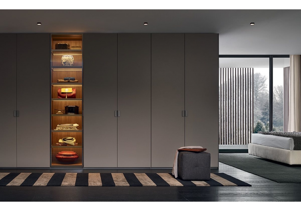 Fitted diseñado por Rodolfo Dordoni para Poliform es un armario con puertas de cristal o lacado mate y marco de aluminio.