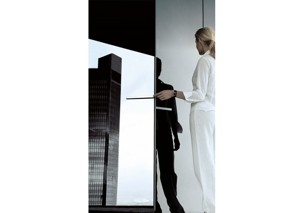 Ocean diseñado por R&D Poliform es un armario con puertas en vidrio y perfiles de aluminio. Disponible en diferentes acabados y composiciones.