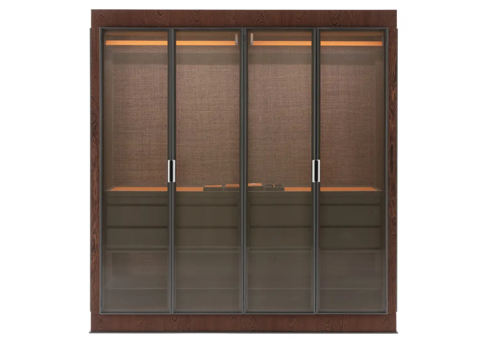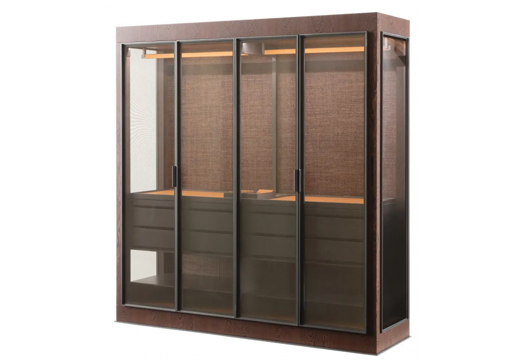 Eracle diseñado por Antonio Citterio para Maxalto es un armario con estructura de roble en diferentes acabados o en wengué natural. Estructura interna en melamina cuero colonial. Tablero, cajonera y tubo perchero revestidos en cuero colonial Alfa. Puertas batientes en cristal transparente acopladas a inserción de tejido técnico metalizado bronceado. Perfil de puerta, zapatero multifunción, estructura y frentes de cajonera pintados en níquel bronceado. Trasera en cristal transparente o revestida en rafia oscura. Disponible con o sin iluminación LED.