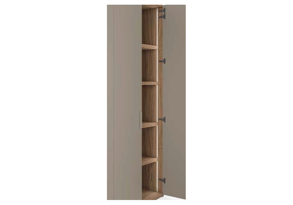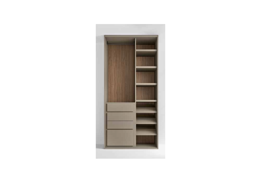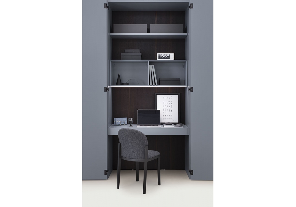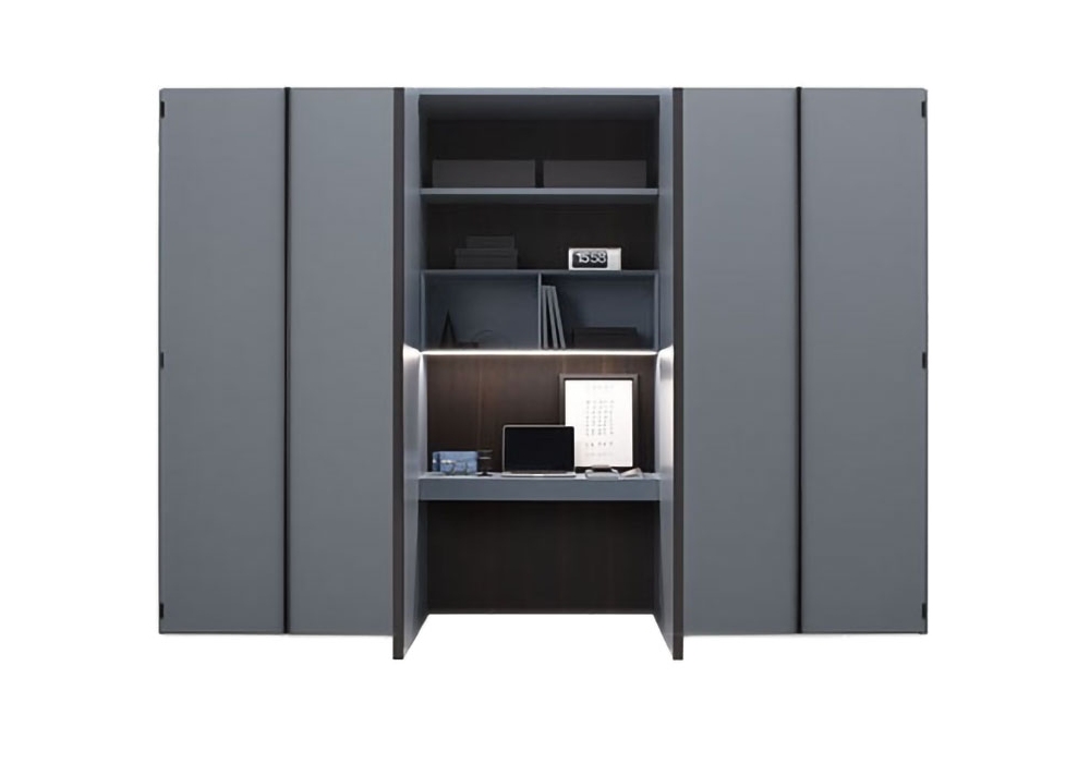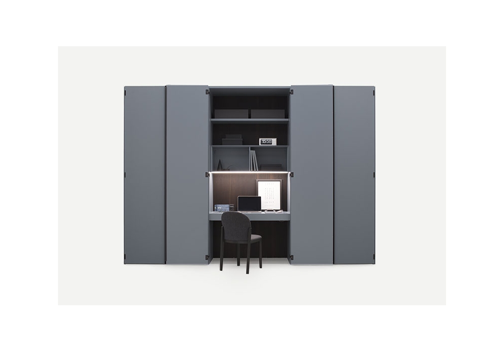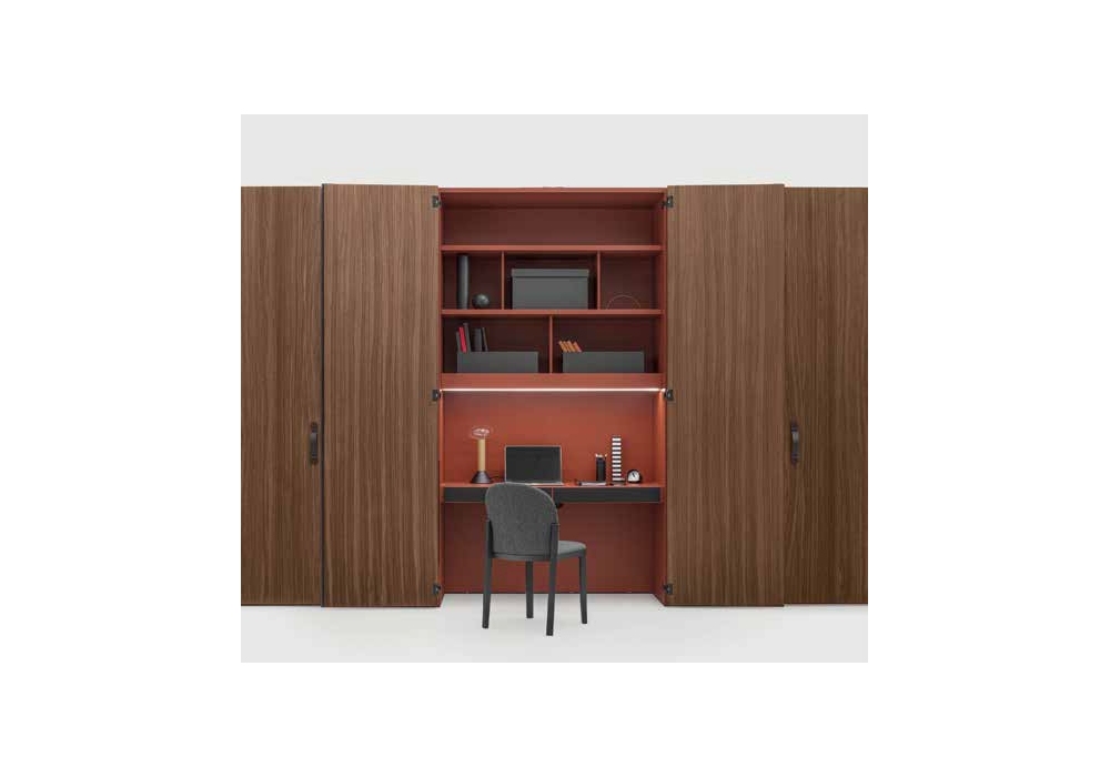 Amalfi diseñado por Pianca es un armario modular realizado con puertas batientes, correderas, coplanares o batientes en acabados Essenza, texturizados o lacados mate o brillo. Posibilidad de añadir escritorio con cajoneras, estantes y módulos abiertos encerrados detrás de las puertas.