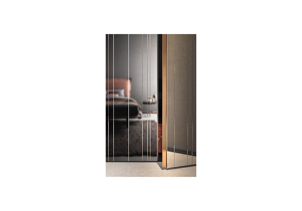Raggio diseñado por Pianca es un armario modular realizado con puertas de cristal o espejo con grabados verticales. Tiradores de altura completa en el interior de la puerta fabricados en aluminio lacado o con acabado metalizado.