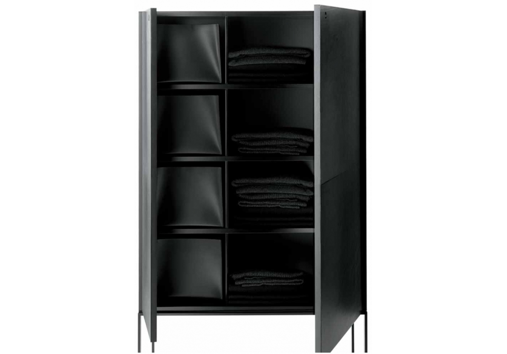 Arabesque diseñado y producido por Ivano Redaelli es un armario de dos puertas de forma cuadrangular estructurado en madera revestida de piel plena flor o lacada en barnices mates o brillantes. La base es de metal color bronce o níquel.