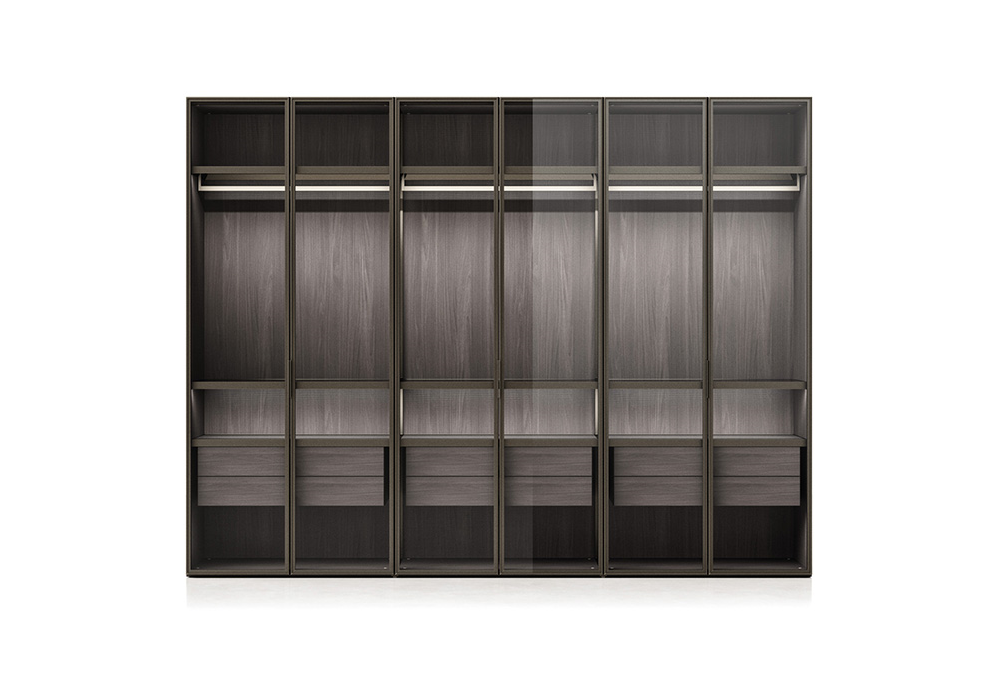 Zeus diseñado por MisuraEmme es un armario realizado con elegantes perfiles metálicos que potencian la versatilidad dimensional de los sistemas de noche; combinados con la transparencia del vidrio, otorgan a las superficies una extrema pureza formal. Los tiradores dedicados encajan en el marco para una solución contemporánea de gran valor estético y funcional.
