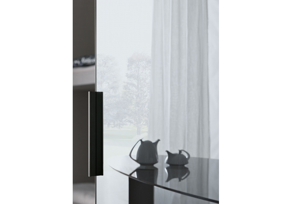 First diseñado por MisuraEmme es un armario que retoma la sugerente transparencia del vidrio, el juego de reflejos de los espejos, los colores claros de los armarios que multiplican los espacios, reduciéndolos al infinito.
