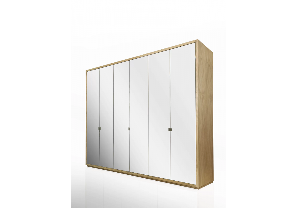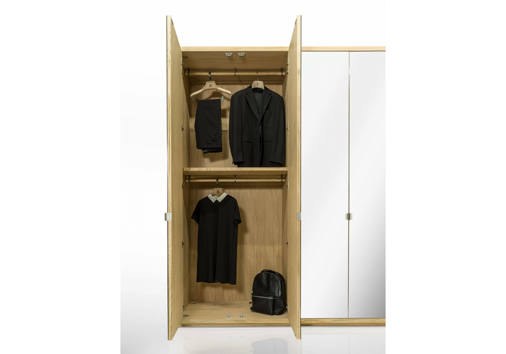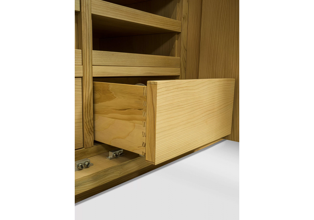 Cornice diseñado por Authentic Design para Riva 1920 es un armario en madera maciza y blockboard, caracterizado por puertas batientes con espejo y estructura en madera maciza, con interiores en madera de cedro perfumada, un remedio natural contra las polillas. Personalizable con la inclusión de percheros, baldas, cajoneras de madera maciza con uniones tradicionales en cola de milano y diversos accesorios, ofrece una organización funcional y modular de los distintos elementos en función de las necesidades y dimensiones de almacenamiento requeridas.
