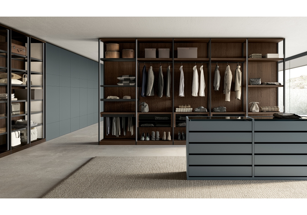 Scena diseñado por Dall'Agnese es un vestidor realizado con una estructura con paneles de aglomerado de madera certificada con acabado melamínico. Estructura de aluminio pintado de color negro o titanio, con travesaños para la fijación de estantes y equipos internos. Zócalo y pies regulables para garantizar la estabilidad y la alineación.