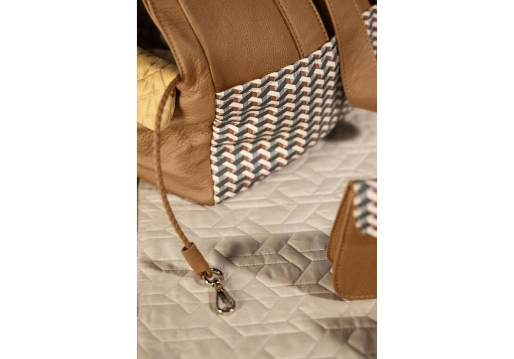 El Dog Bag diseñado por Poltrona Frau Style & Design Center es un bolso de transporte compuesto por un cuerpo y una bandolera reforzada en Pelle Frau® ColorSphere®. Los bolsillos delanteros y la presilla para la correa para el hombro están hechos de Pelle Frau® Motif Weavers. El forro interior es de tejido 100% algodón con bolsillo interior forrado en piel y cremallera metálica. El forro presenta una etiqueta de tejido Poltrona Frau®. El forro interior es extraíble y lavable. La base interna es de policarbonato ligero alveolar.