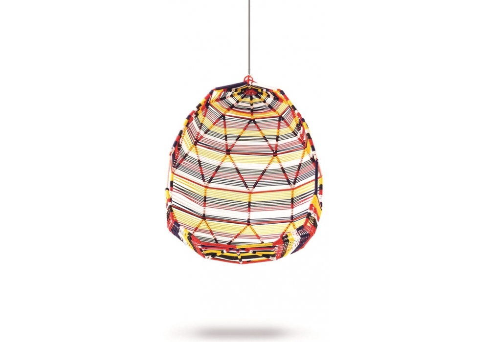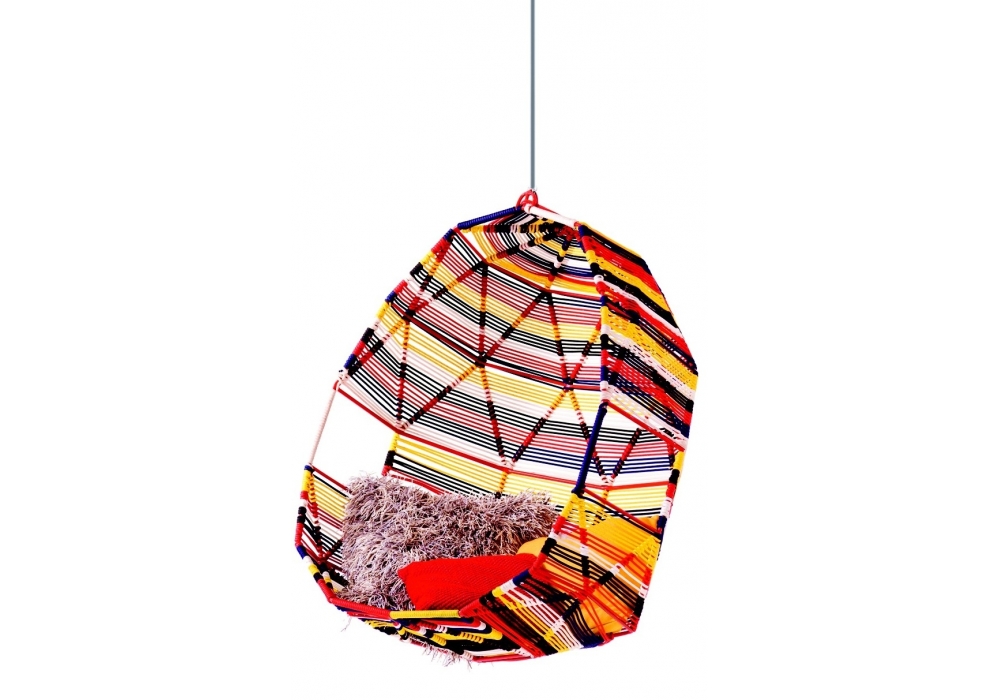 Tropicalia es un Cocoon con cinco cojines diseñado por Patricia Urquiola para Moroso. Estructura en acero barnizado rojo, RAL 3020, y trenzado de hebras de polímero de ingeniería natural o multicolor.