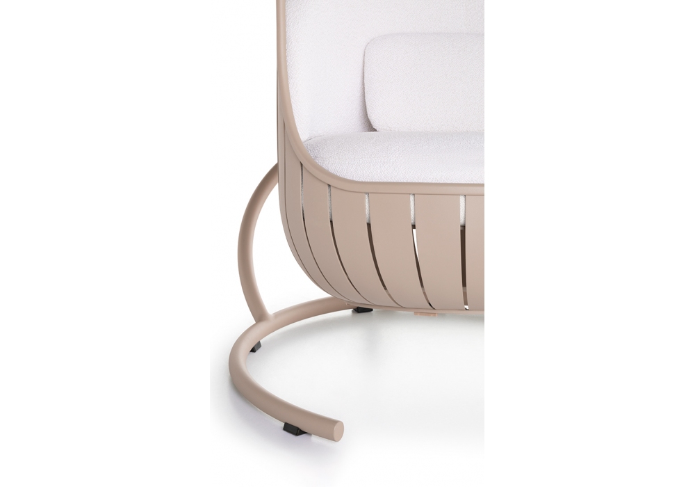Arena Columpio diseñado por Søren Rose es un sillón colgante con estructura de aluminio con recubrimiento en polvo y cuerda trenzada de poliéster, y asiento, respaldo y cojines de gomaespuma de poliuretano y fibra de poliéster con tejido hidrófugo. Peso máximo recomendado para un columpio suspendido: 150 kg. Disponible en diferentes acabados.