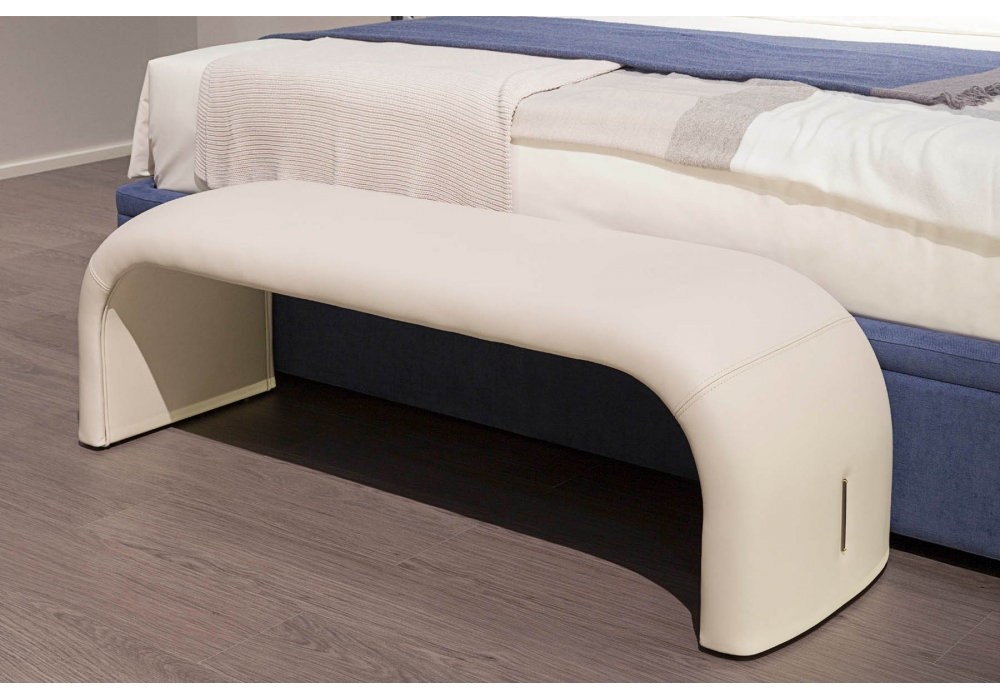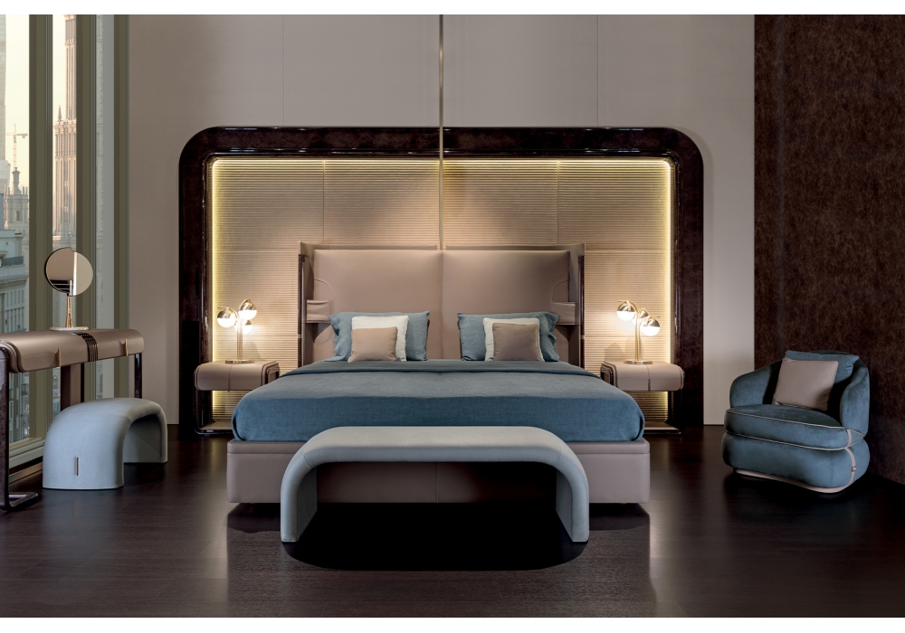 Eclipse diseñado por Andrea Bonini para Turri es un banco con estructura en madera maciza y contrachapado acolchado con espuma de poliuretano con revestimiento fijo en piel o tejido con inserciones de metal en un acabado dorado claro.