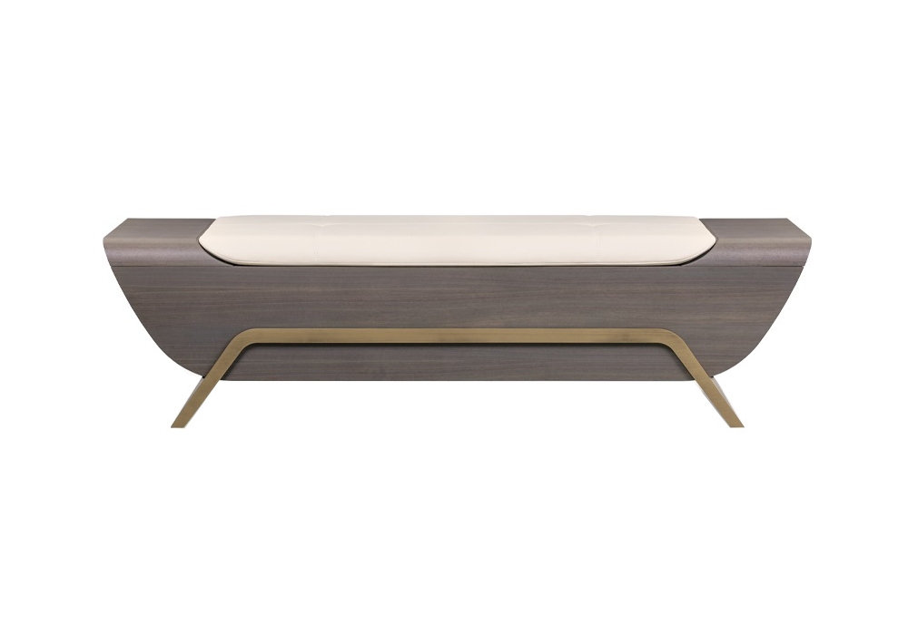 Melting Light diseñado por Frank Jiang para Turri es un banco con estructura en contrachapado chapado en nogal y madera maciza. Revestimiento en piel o tela no desenfundable. Patas de metal en acabado oro cepillado o bronce.
