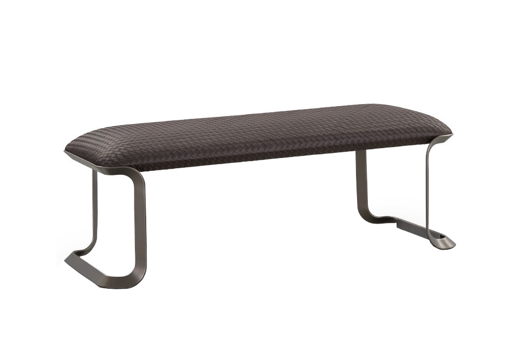 Milano diseñado por Blengini Ghirardelli para Turri es un banco con tejido con estructura de madera contrachapada trenzada con cojines de espuma de poliuretano. Tapicería en diferentes pieles. Patas de metal en acabado níquel cepillado con pies de plástico.