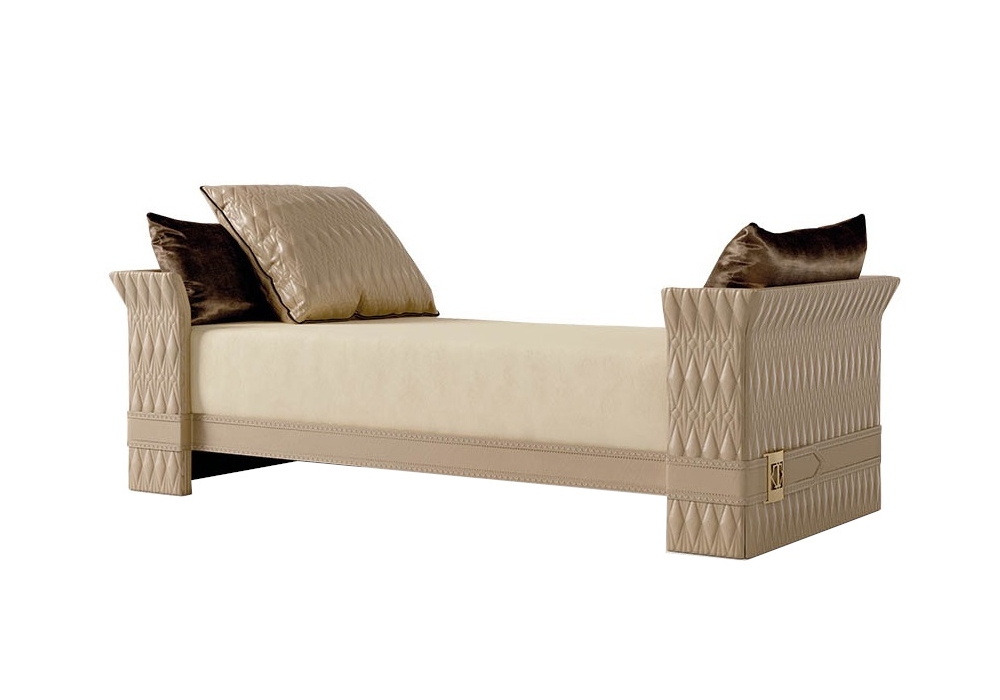 Numero Tre diseñado por Roberto Serio para Turri es un banco con estructura en madera contrachapada y madera maciza acolchada con espuma de poliuretano multidensidad con revestimiento de la estructura en diferentes pieles. Cojines de piel o tela y detalles de metal dorado.