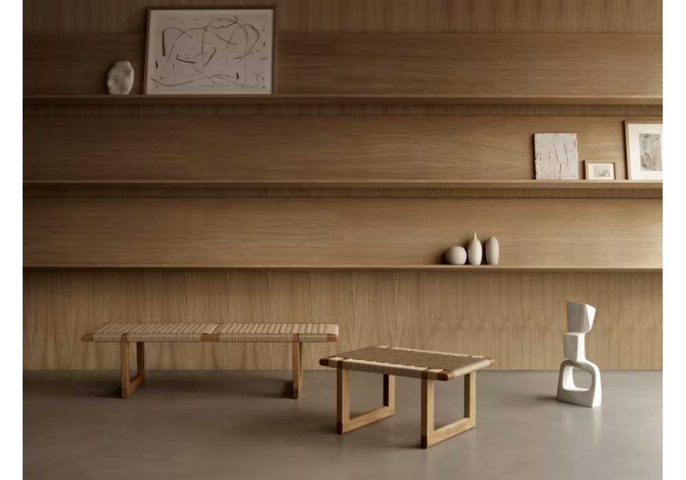 BM0489L diseñado por Børge Mogensen/ Børge Mogensens Tegnestue para Carl Hansen & Søn es un banco con estructura de roble macizo tratado con aceite. Asiento en cordón de papel.