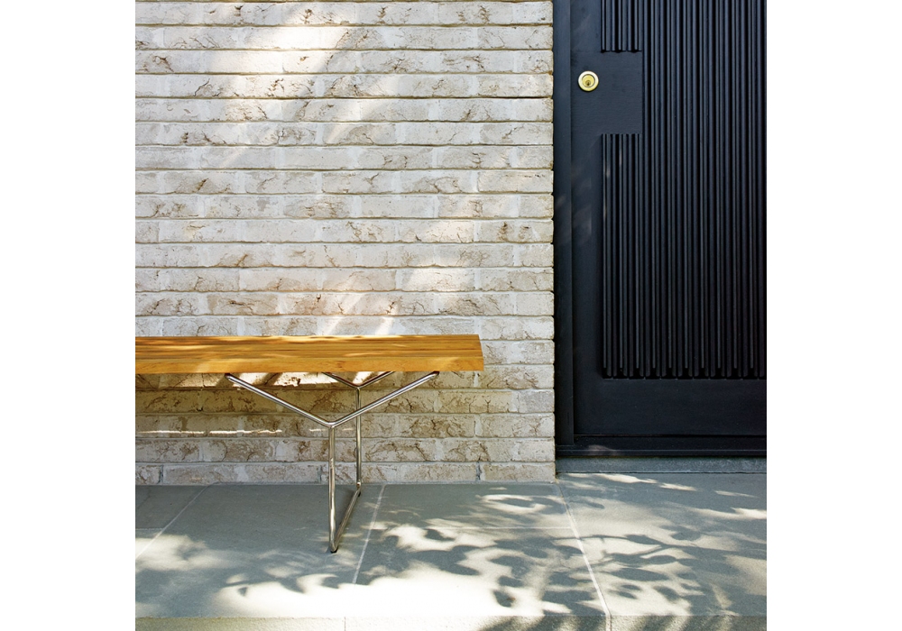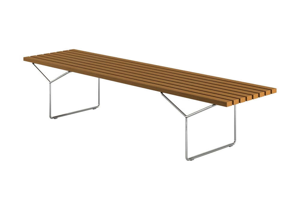 Bertoia diseñado por Harry Bertoia para Knoll es un banco disponible con estructura de acero inoxidable o rilsan y asiento de teca. Es apto para exteriores.