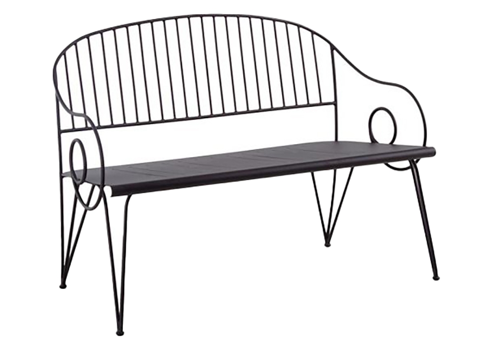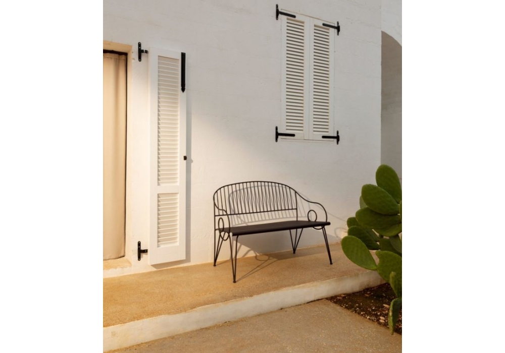 Ariete diseñado por Adam D. Tihany para Unopiù es un banco con estructura en hierro forjado trabajado a mano pintado en color bronce. Los cojines de los asientos están hechos de tela y están disponibles en diferentes colores.