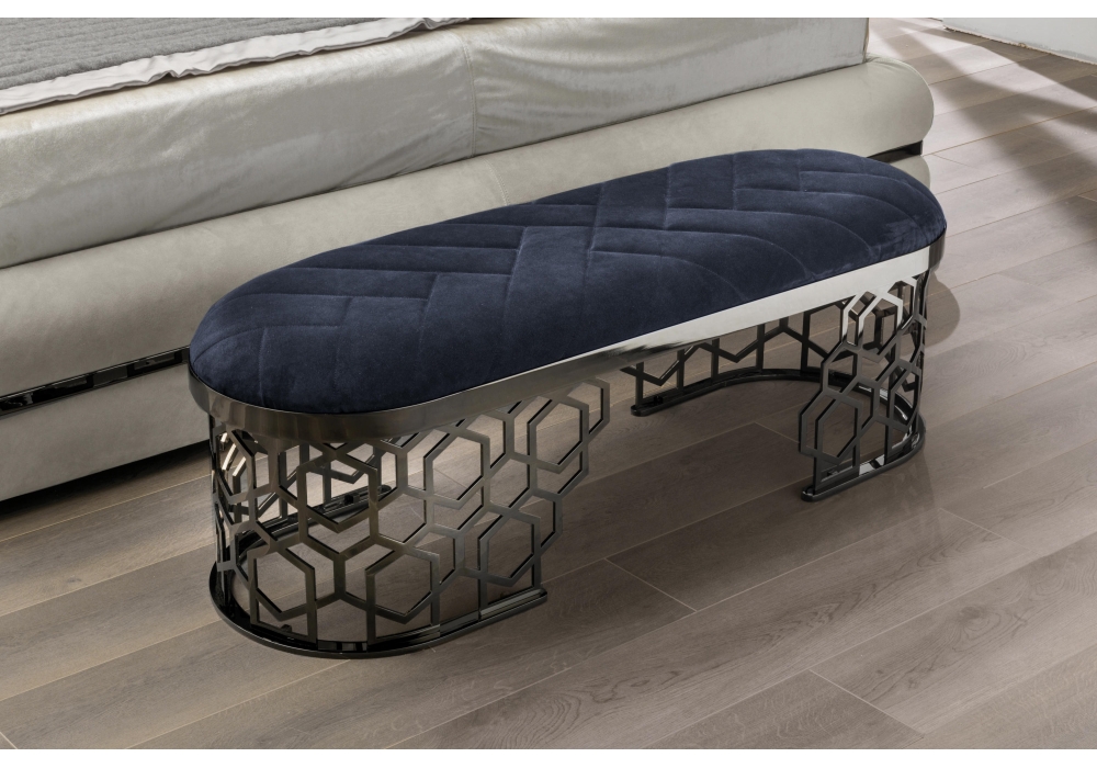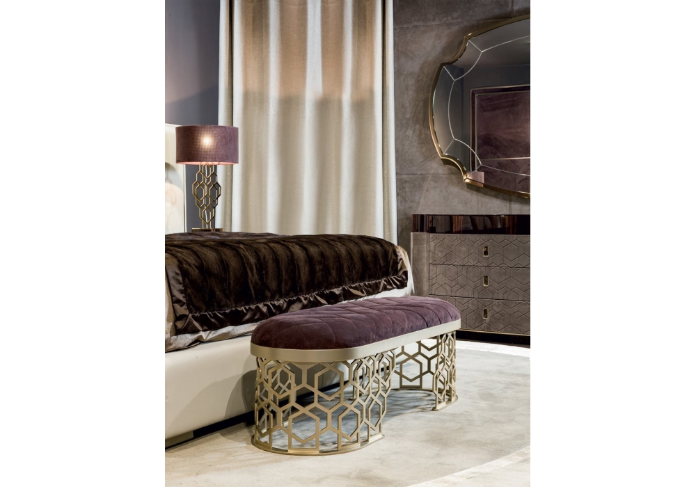 Amanda diseñado por Giuseppe Iasparra para Longhi es un banco con asiento en espuma de poliuretano de densidad media, tapizado en tejido o piel. Cubierta lisa o acolchada. Base de metal con decoración "Secuencia", disponible en diferentes acabados.