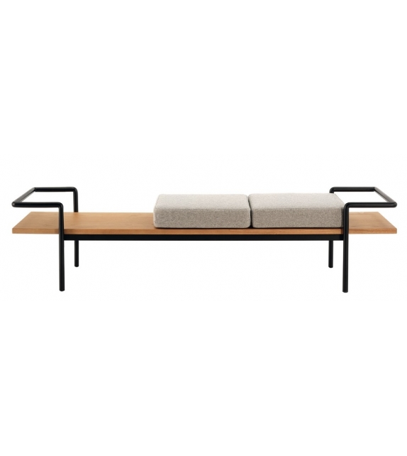 Poltrona Frau T 904 panchina: La estructura ha sido minuciosamente diseñada en acero tubular con acabado negro. Un asiento esencial, compuesto por una tabla de multicapa de álamo con enchapado de fresno teñido teca, capaz de complementarse opcionalmente con tres cojines que se apoyan sobre la superficie de madera. Un mueble que, con su línea nítida y el empleo del tubular, sintetiza el diseño de los años 50 con personalidad propia. En el universo Poltrona Frau, el T 904 se puede combinar con gran transversalidad y armonía a otras piezas más clásicas o contemporáneas. Los cojines están rellenos de espuma de poliuretano y fibra Dacron. El revestimiento es de Pelle Frau® o tejido desenfundable.