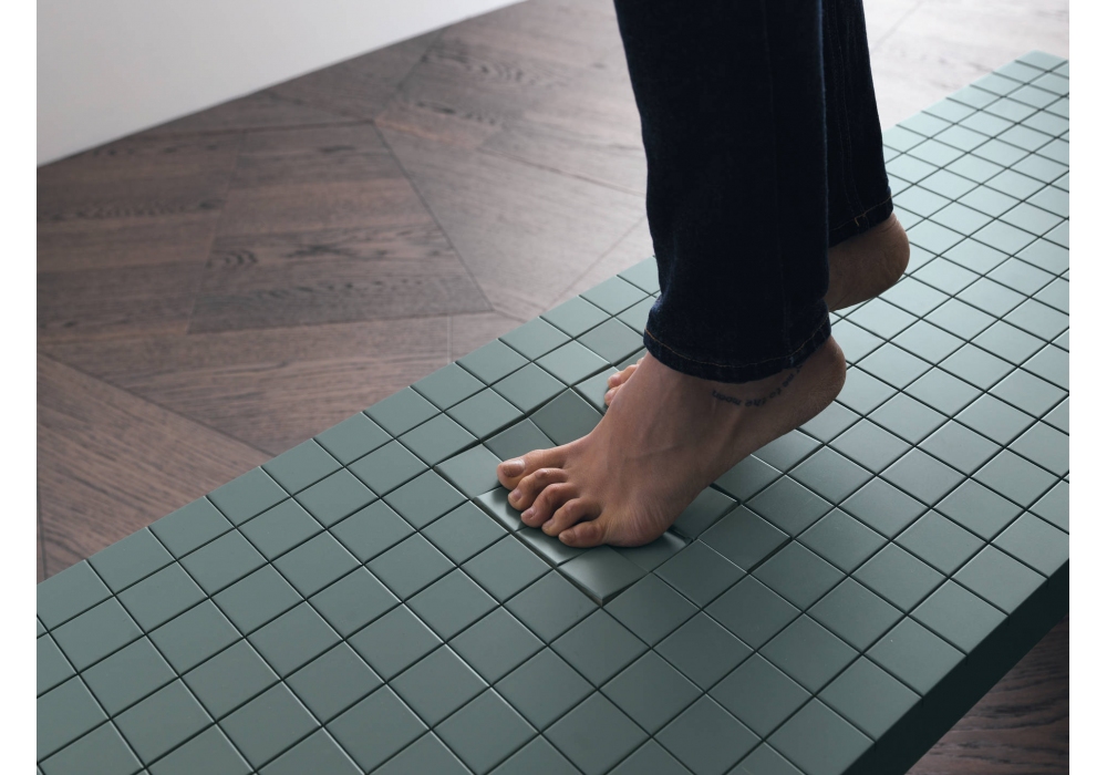 Softbench diseñado por Daniele Lago es un banco con panel superior realizado en MDF y marco perimetral en panel de aglomerado; parte interna en poliuretano. Acabado lacado en varios colores. Soft Bench tiene líneas simples y asientos suaves e innovadores. Un panel de madera y goma espuma combinados de una manera innovadora para crear un mosaico que parece rígido que en realidad se moldea bajo el peso de su cuerpo.