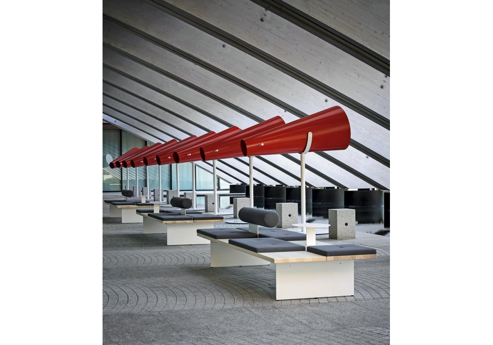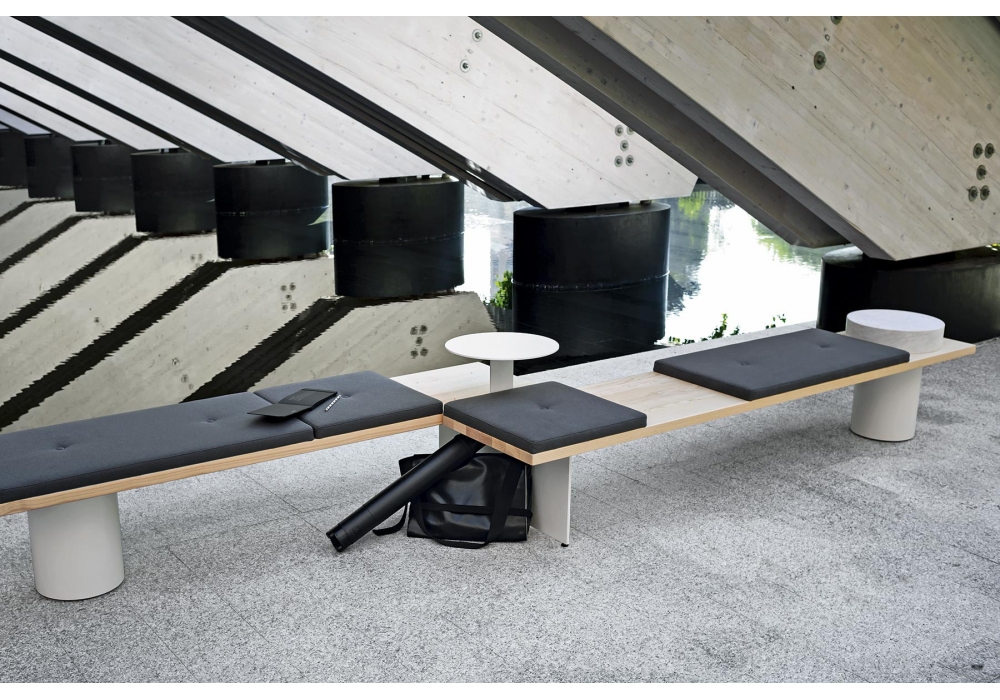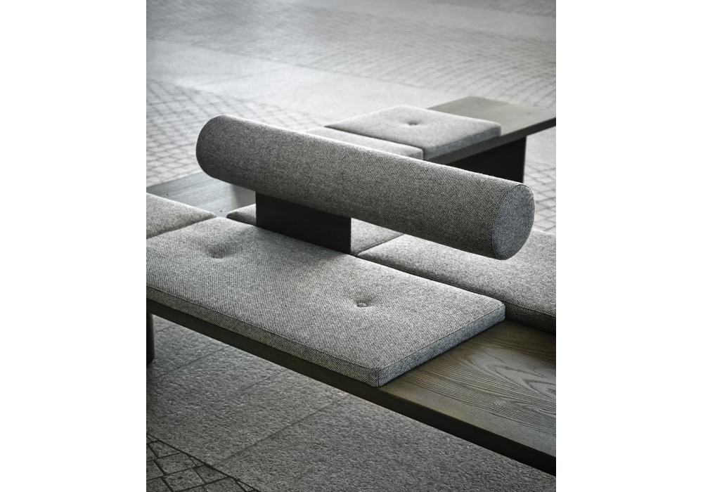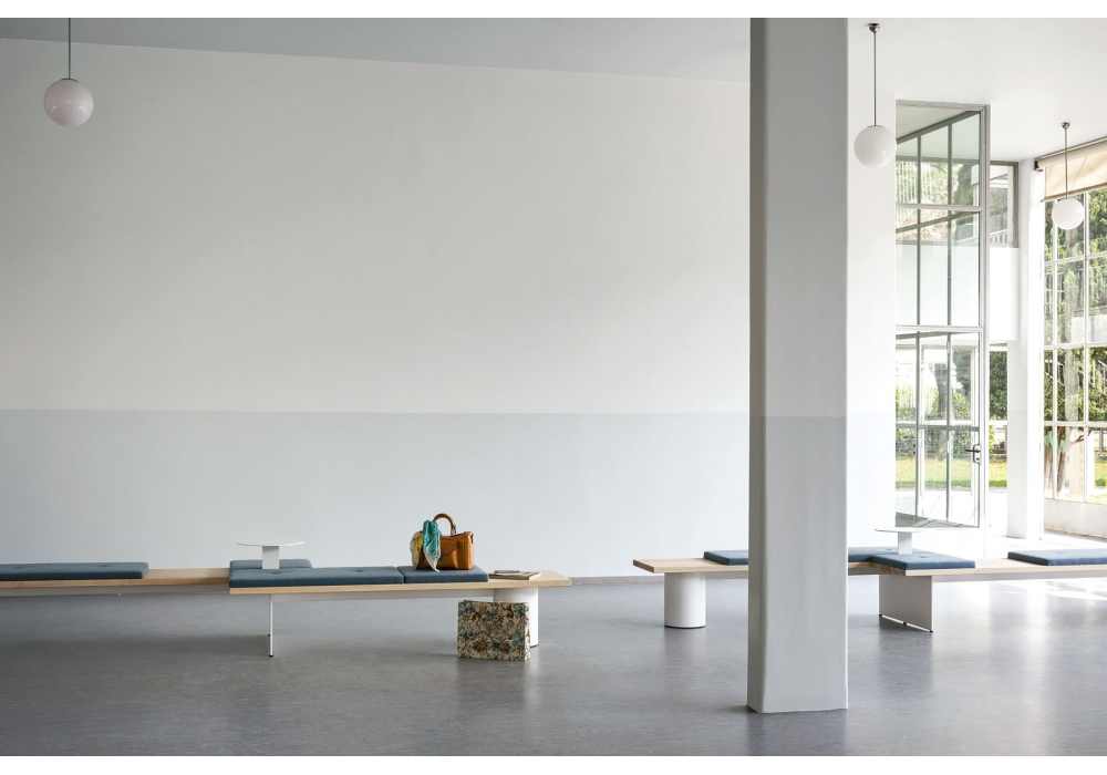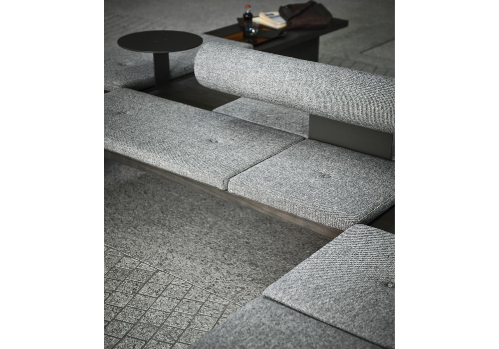 Galleria diseñado por Pearson Lloyd para Tacchini es un sistema modular con estructura de fresno que permite crear varias soluciones: banco lineal, asiento de doble esquina, isla. La base es una viga de acero disponible en diferentes composiciones y tamaños, sobre la que se fijan cojines de asiento con fundas no desenfundables. Es posible agregar accesorios como mesas de centro en diferentes materiales y un cojín lumbar.