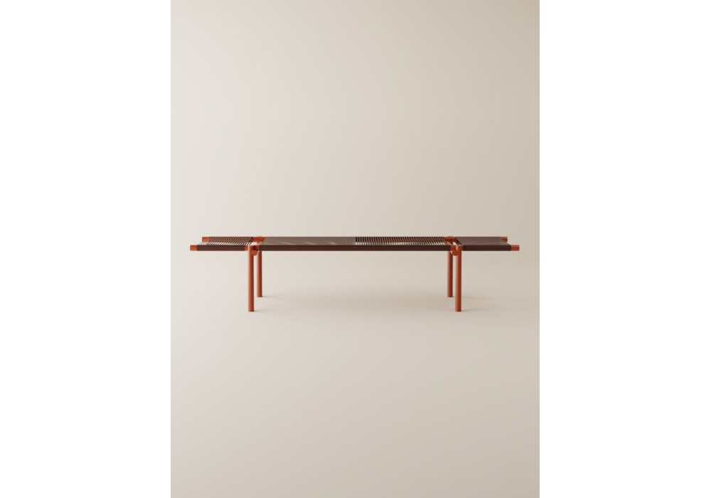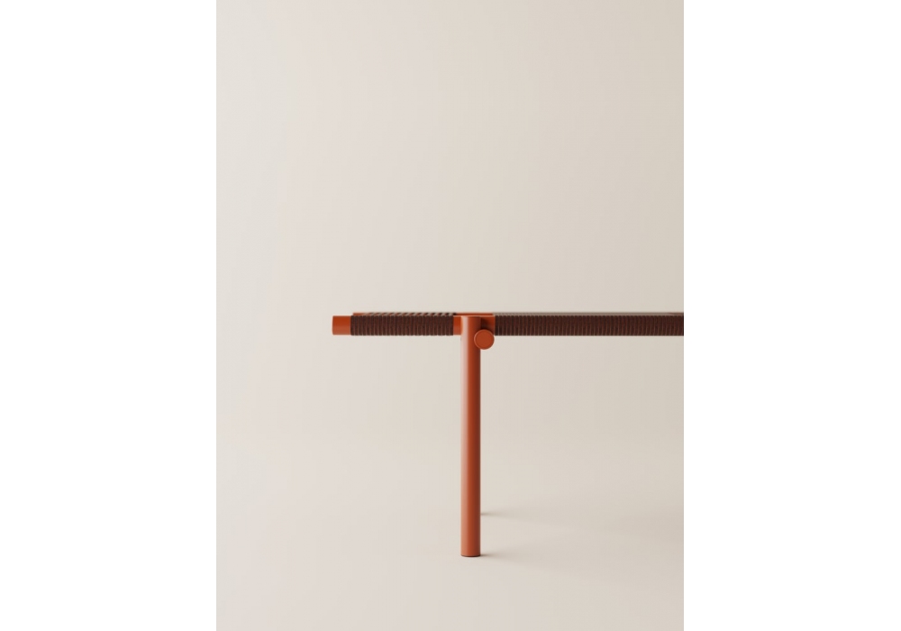 Rendez-vous diseñado por Marco Carini para Agape es un banco con estructura de aluminio pintado. Las superficies de apoyo están realizadas con tiras de corcho tostado, con un núcleo técnico de nailon trenzado a mano. Como accesorios se pueden añadir bandejas de aluminio pintadas en el mismo acabado que la estructura.