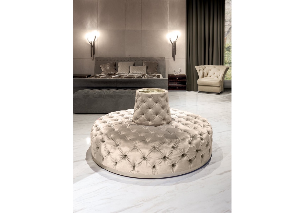 Miur diseñado por Elle Studio para Longhi es un banco con estructura de madera recubierta de espuma de poliuretano de densidad diferenciada, base caracterizada por un anillo de metal brillante o mate y tapizado fijo en tela o piel con acabado Capitonné con macizo o, bajo pedido, con Swarowski cristales