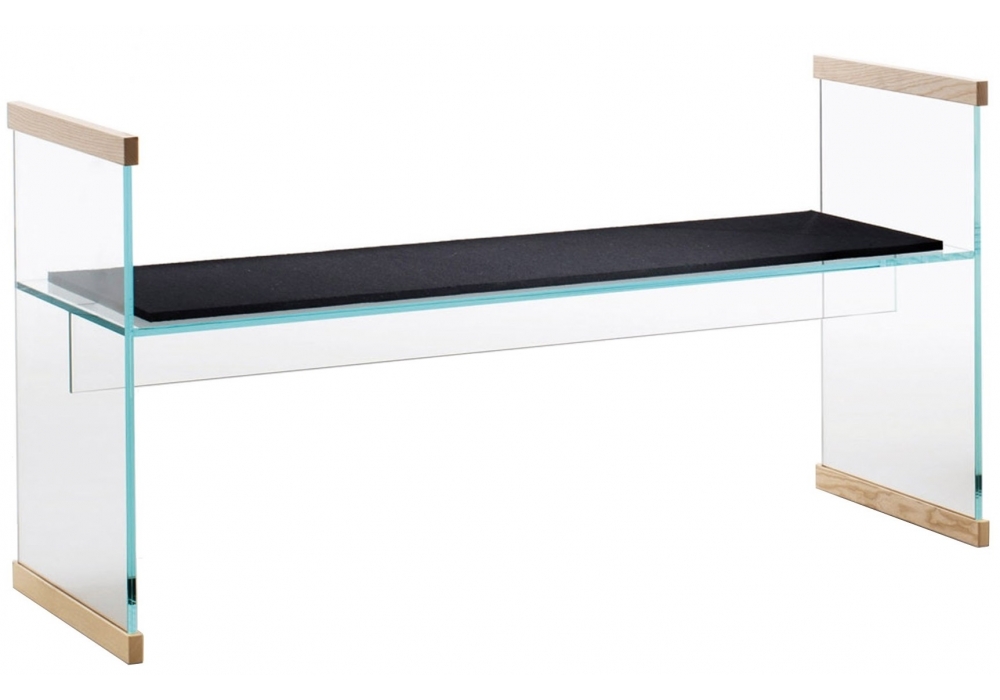 Diapositive by Glas Italia is a collection comprising a bench, sofa, desks and small bookcase in transparent extralight, laminated and thermo-welded glass with elements of solid natural ash or dark brown oak at the outer edges of the supporting sides. The bench is available in transparent glass in the following finishes: extralight, clear grey, dark grey, lilac or orange.