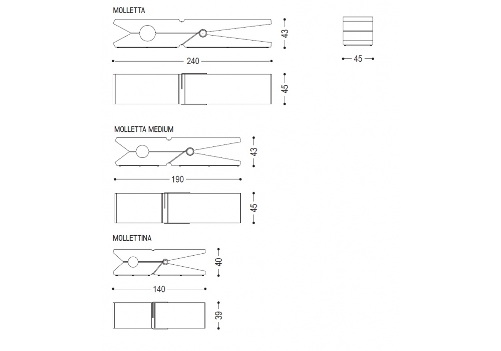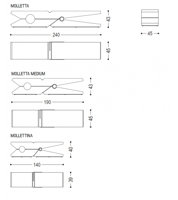 | Dimensiones | MOLLETTA_ 240 x 45 x H 43 cm; MOLLETTAMEDIUM_ 190 x 45 x H 43 cm; MOLLETTINA_ 140 x 39 x H 40 cm. |