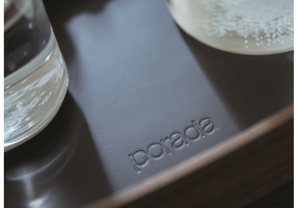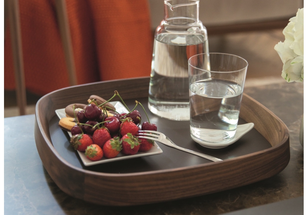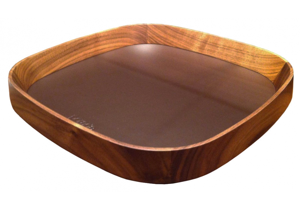 Mix Tray diseñada por Carlo Ballabio para Porada es una bandeja en nogal canaletta disponible en diferentes acabados y revestimiento en cuoietto en varios colores.