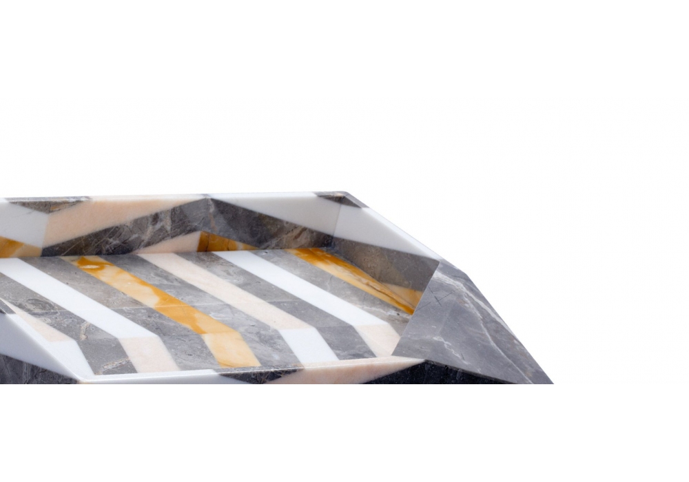 Earthquake 5.9 diseñada por Patricia Urquiola para Budri es una bandeja policromada en mármol.