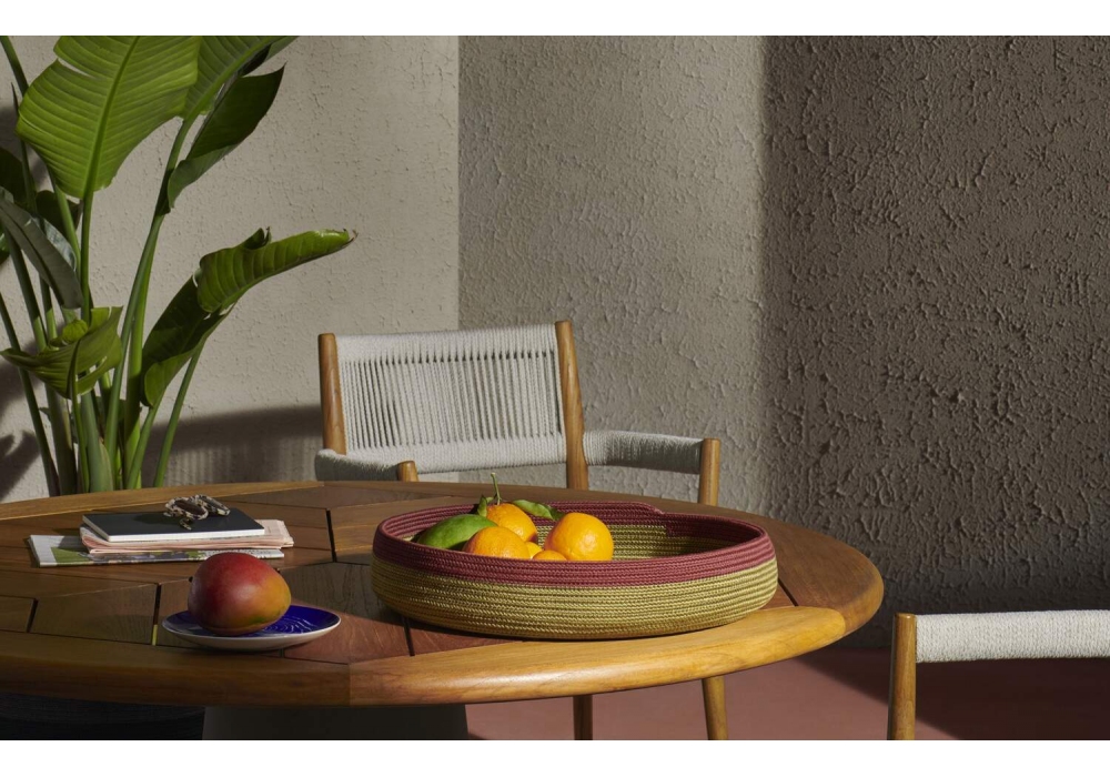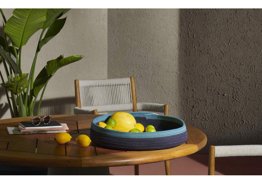 Matam Objects diseñado por Cassina es un centro de mesa realizado en hilo de polipropileno, en los colores: azul/azul claro y verde oliva/bordeaux.