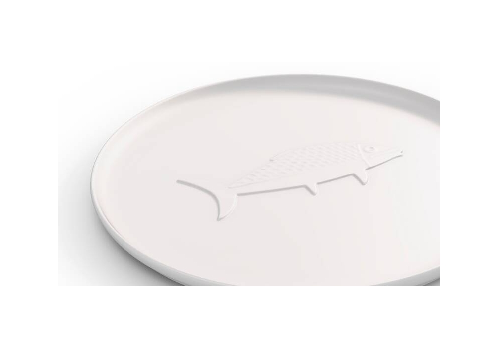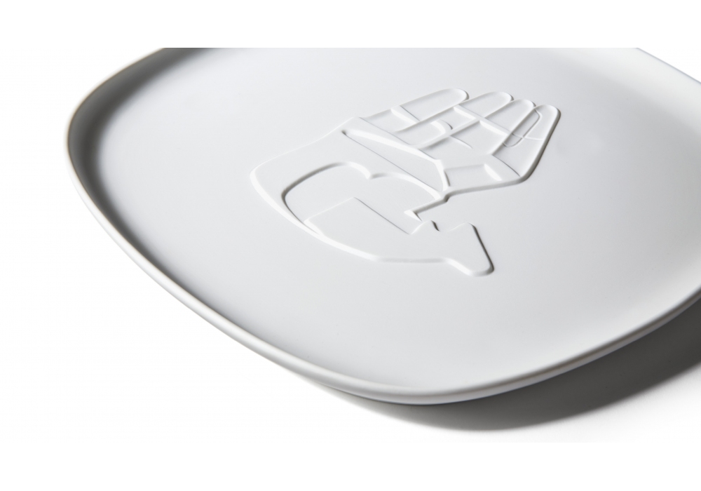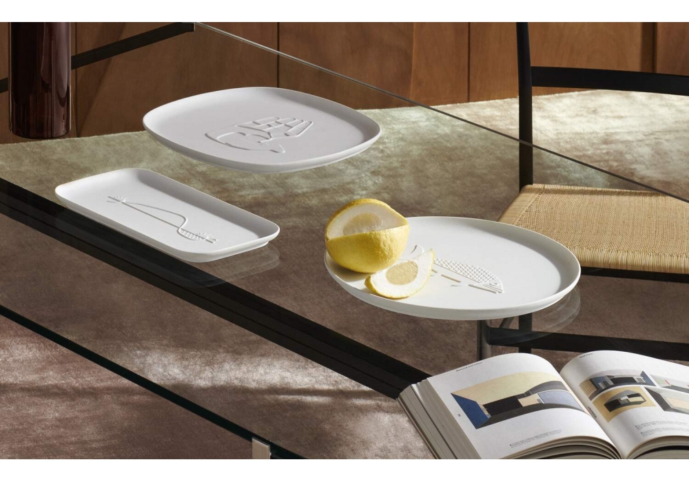 Collection Chandigarh diseñada por Le Corbusier para Cassina es una bandeja en pura porcelana sin esmaltar, disponible en tres dimensiones y con tres símbolos diferentes en bajorrelieve.